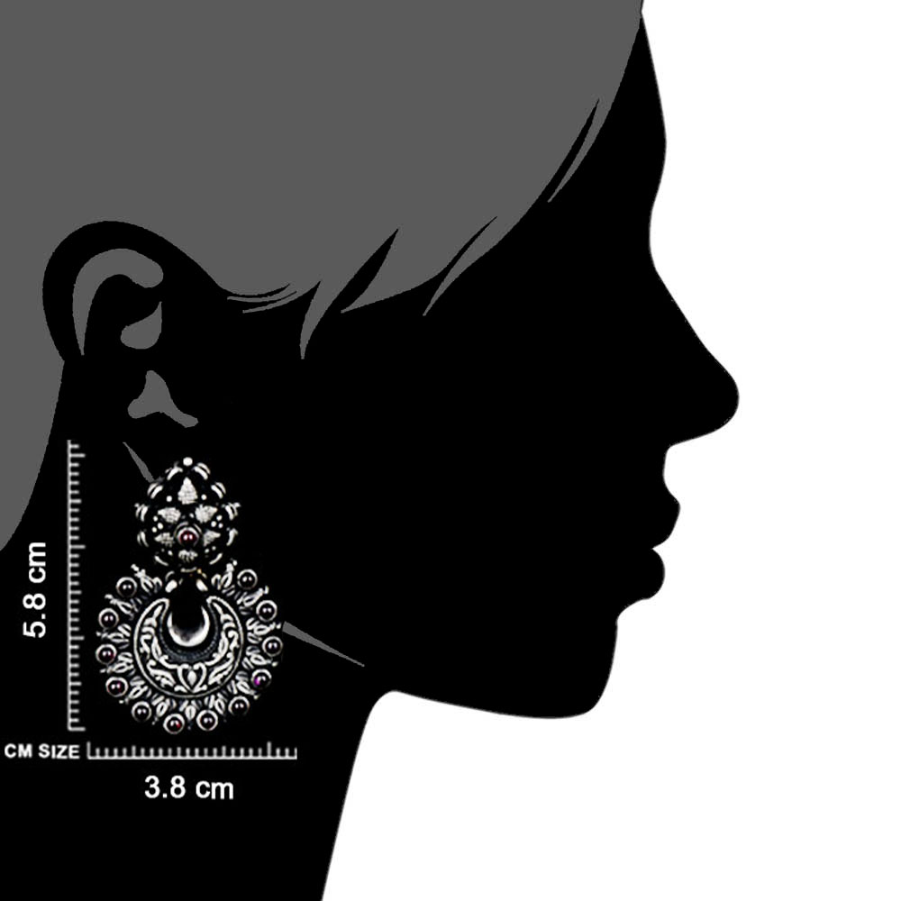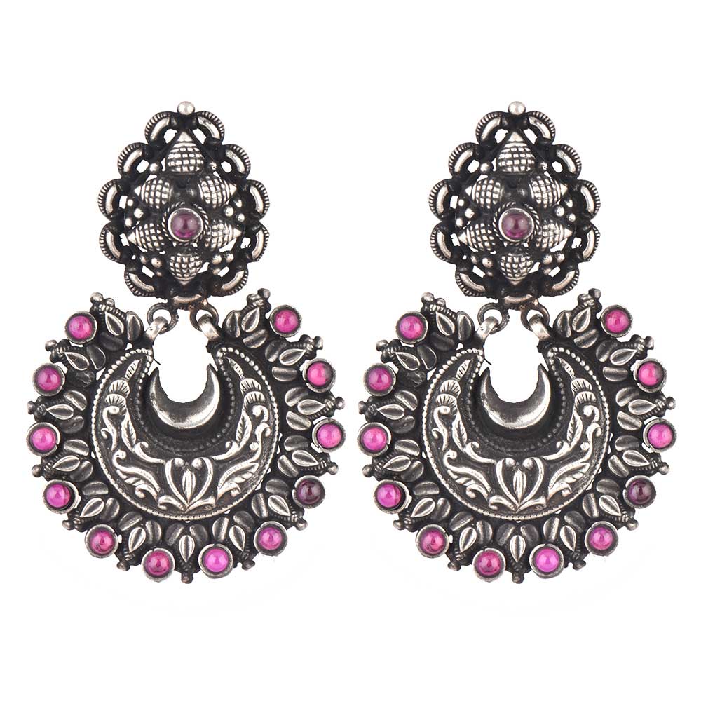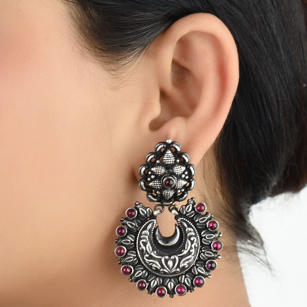 Handmade 92.5 Sterling Silver Chandbali Earrings with Big Floral engraved stud and the hanging is engraved with leaves and Amethyst stones. A must have party wear, festive wear and an ideal option for your sister, wife, friend or any near or dear ones.