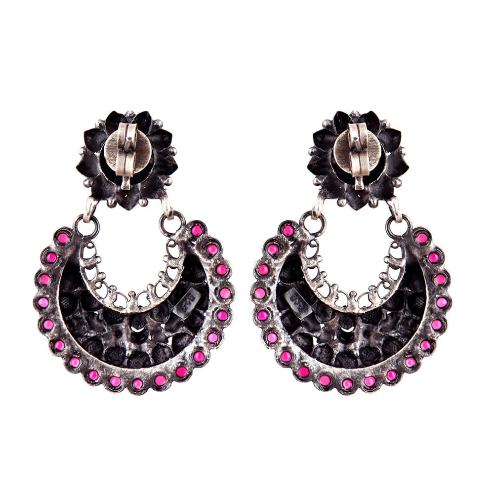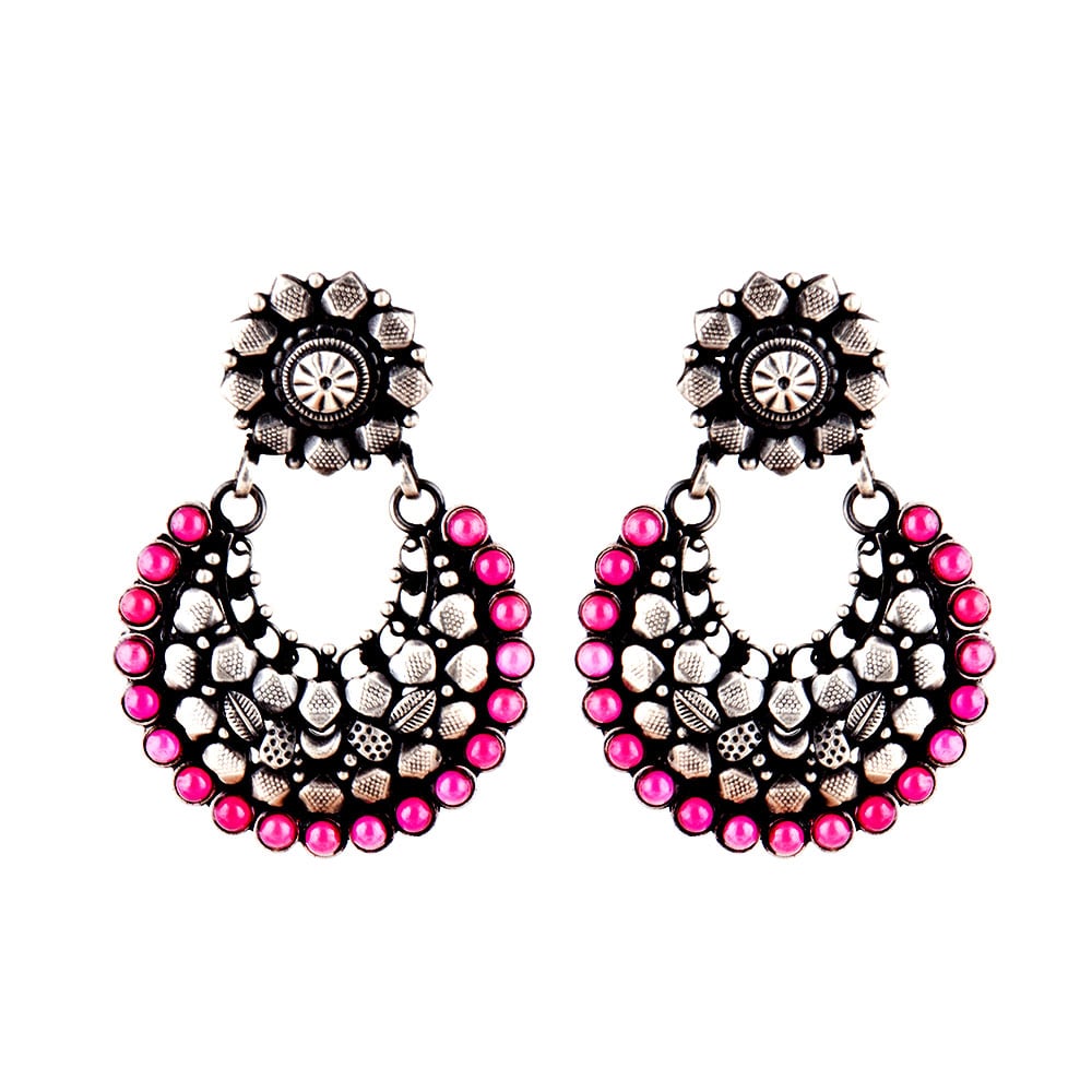 Handmade 92.5 Sterling Silver Earrings tribal design Chandbali earrings with small round pink jade stones on the border of the bali . This is the perfect accessory to enhance the beauty of an ordinary suit, lehenga or other casual