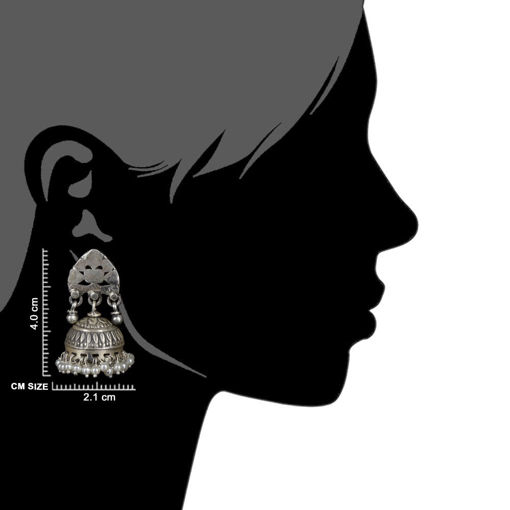 Give a traditional look to all your traditional outfits with this 92.5 Sterling silver earrings with abstract design engraved o the stud with jhumki in oxidized silver engraved design silver bead hanging at the base of the jhumkis. Light and comfortable for everyday wear. Gift it to your sister, mother or friend.