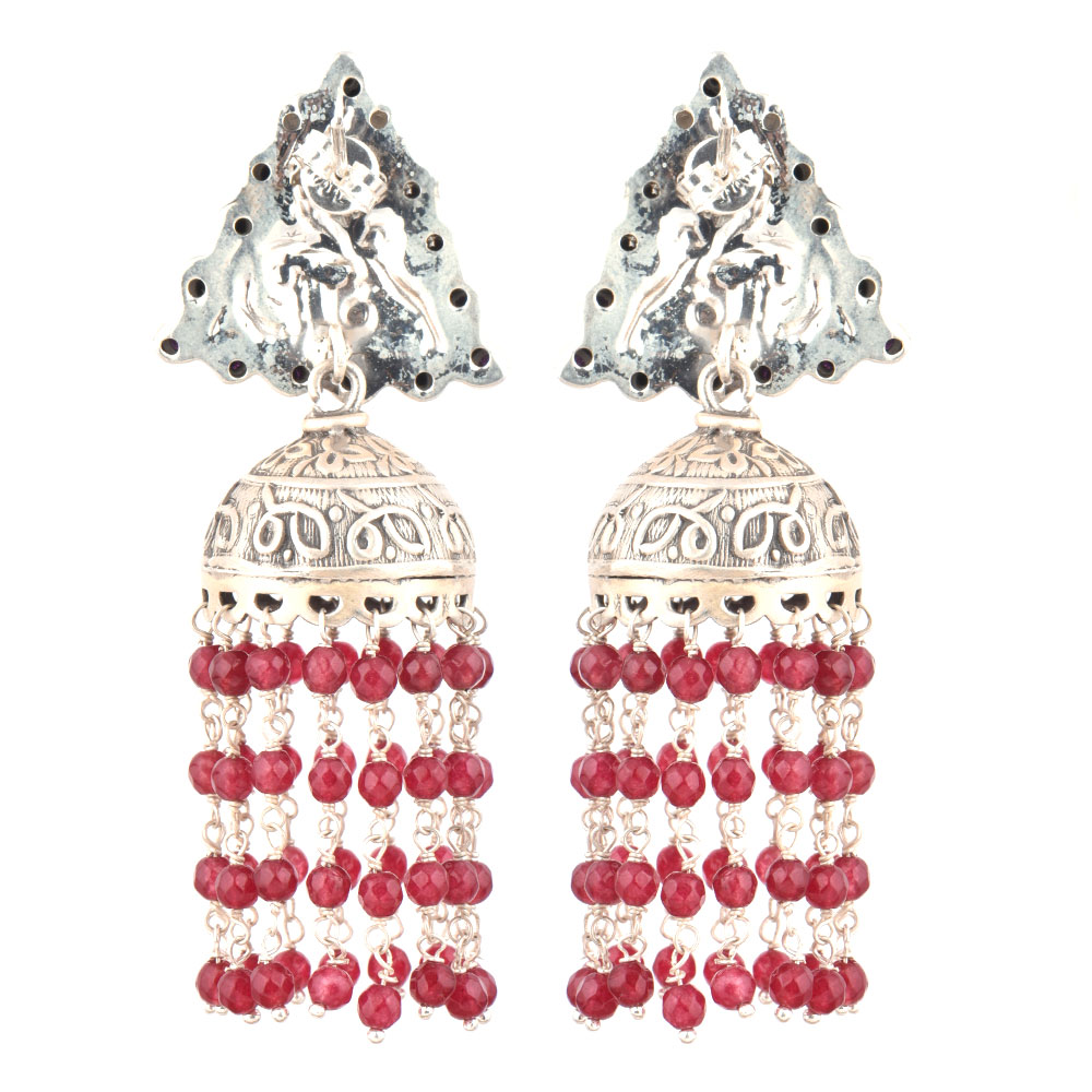 Multi colored stones enhance the beauty of this handmade sterling silver earrings with amethyst stone in triangular pattern and oxidized silver engraved floral design with red onyx beads tassels hanging at the base of the jhumkis. Wear it for wedding, engagements, cocktails ,diwali or other social functions.