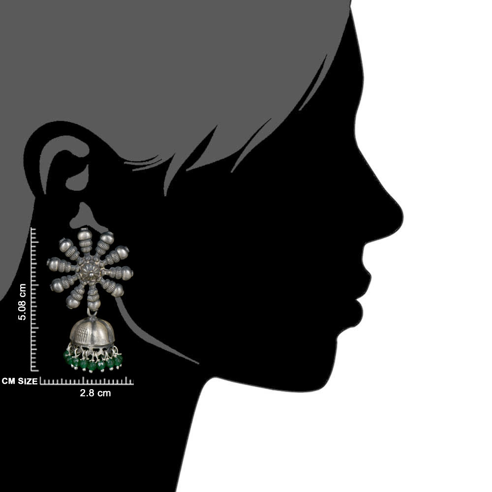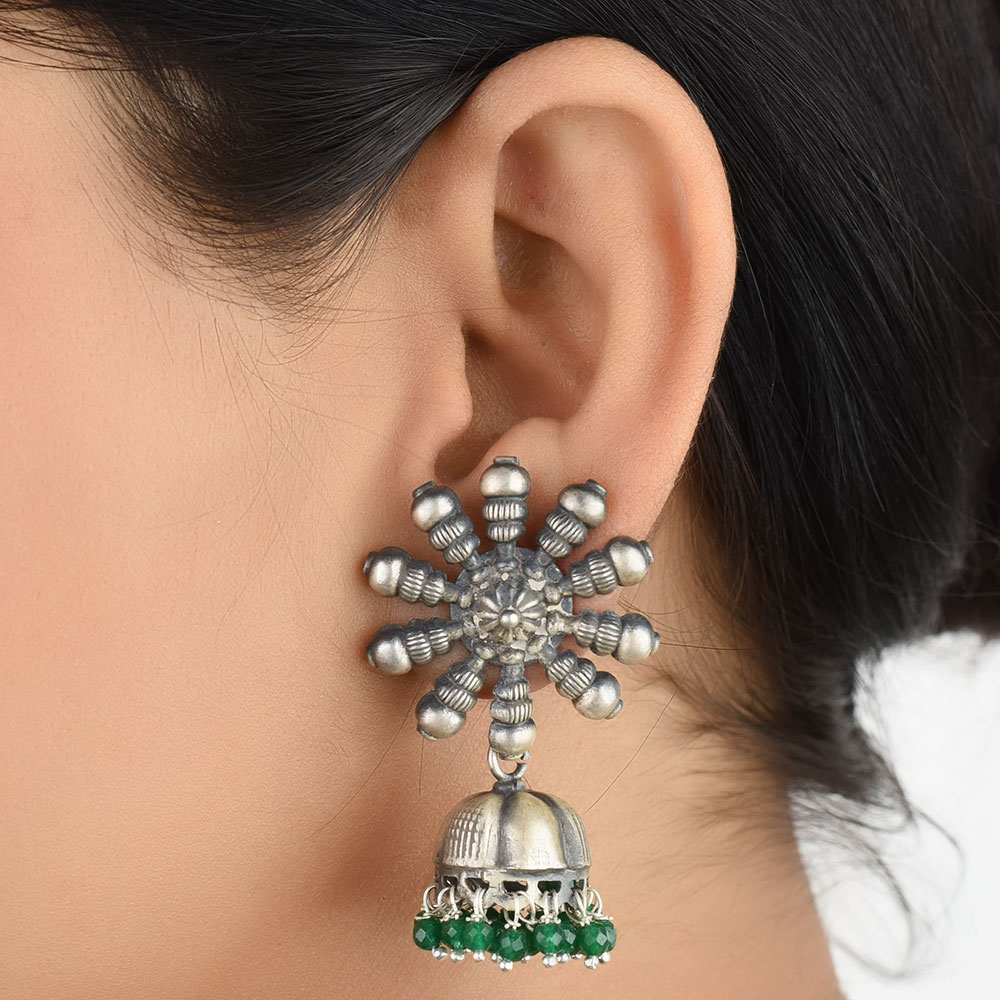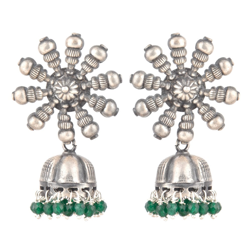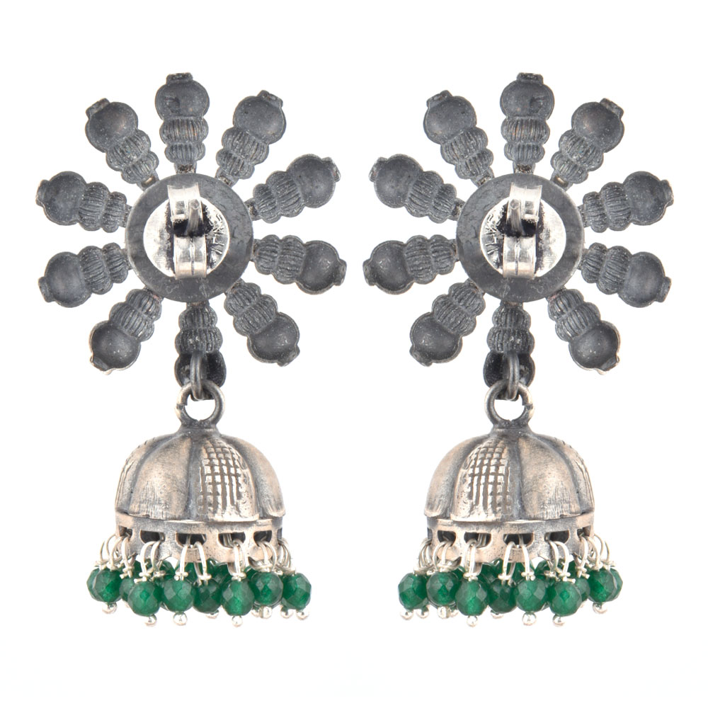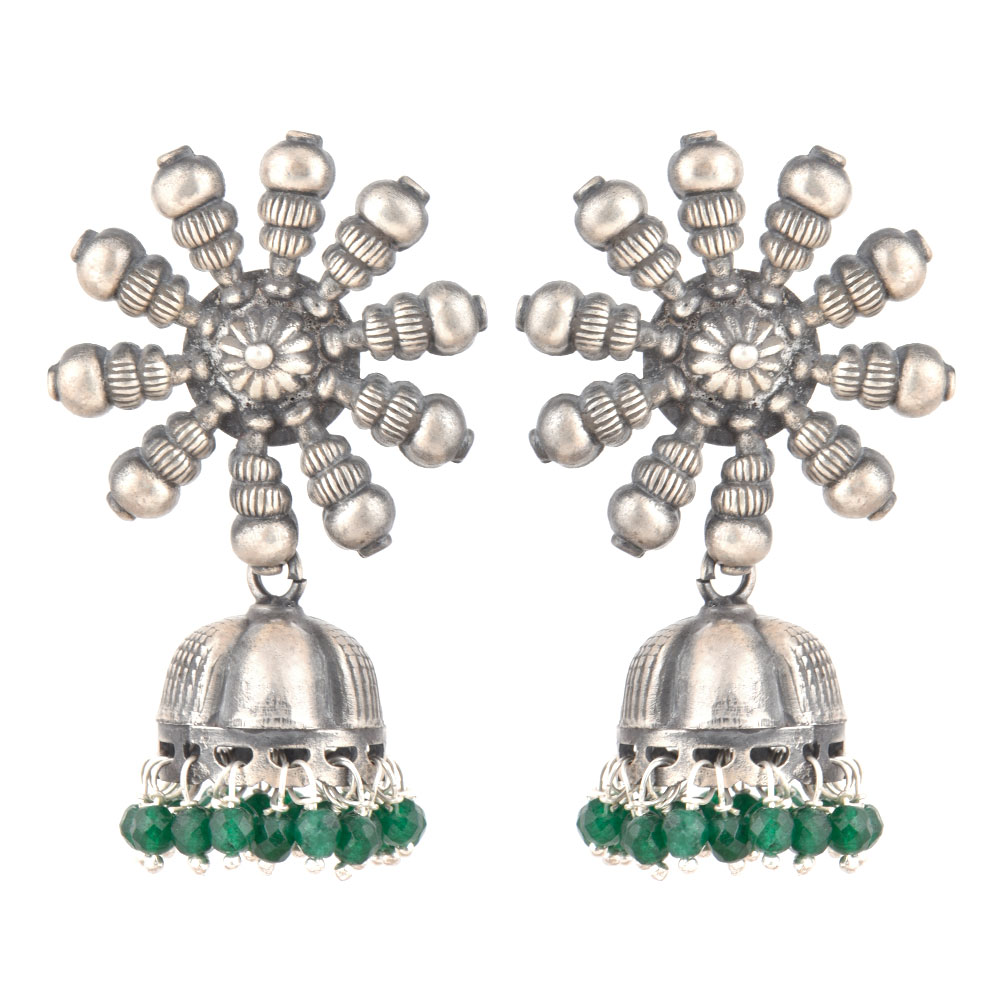 A very formal wear earrings that is made of 92.5 Sterling Silver Earrings the stud is made of a big sunflower design made of silver beads and flower in the centre .The jhumki is made of oxidized silver engraved with floral design and long tassels made of small green onyx and silver stone beads like a chandelier. Perfect party wear accessory , engagements, weddings, cocktail, Christmas and new year.