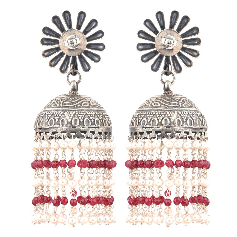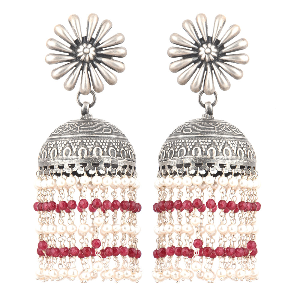Handcrafted fusion traditional and modern design 92.5 Sterling Silver Earrings with a big petals flower design and jhumki engraved with floral design and tassels made of small sterling silver beads finished with small red onyx beads attached to the jhumki.Perfect to be worn on an engagement, wedding, cocktail, reception party or other special function.