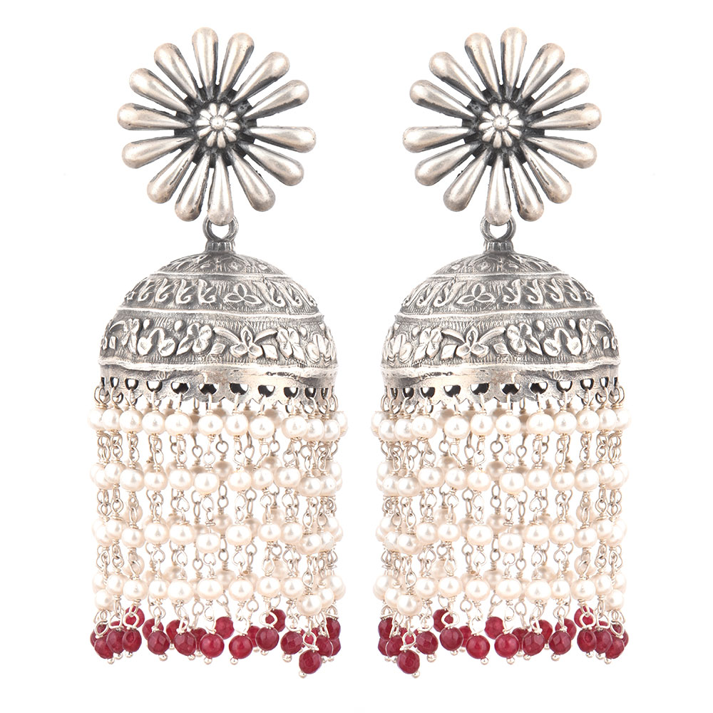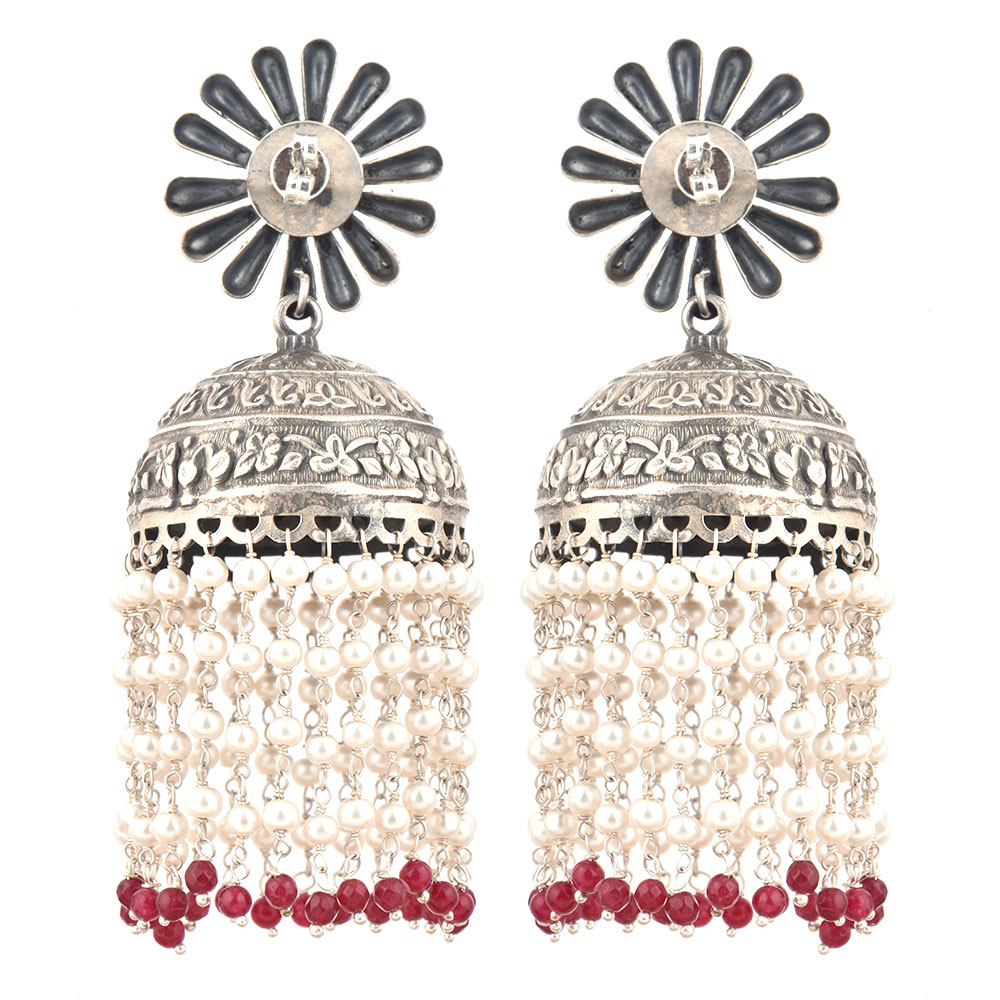 • 92.5 Sterling Silver Earrings Big Petals Flower Stud With Silver Beads And Red Onyx Beads Jhumkis