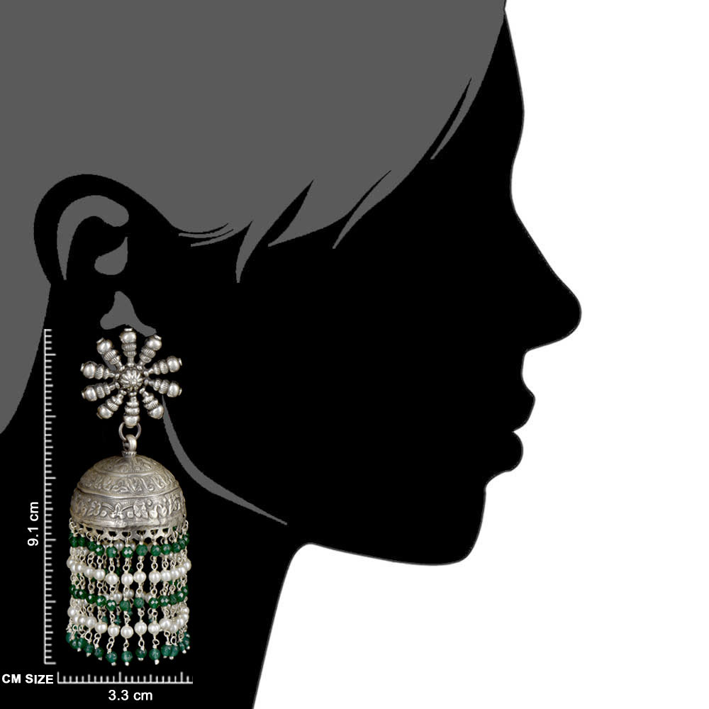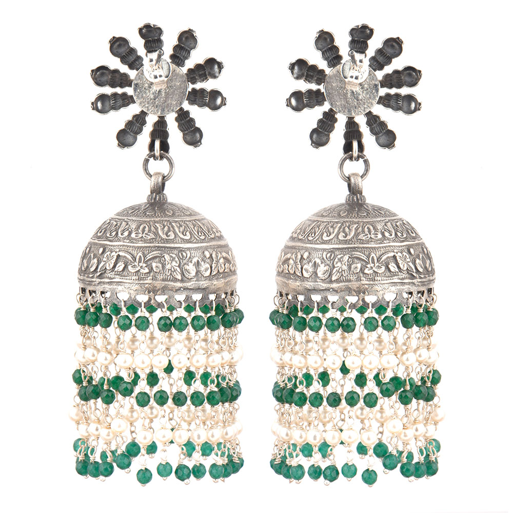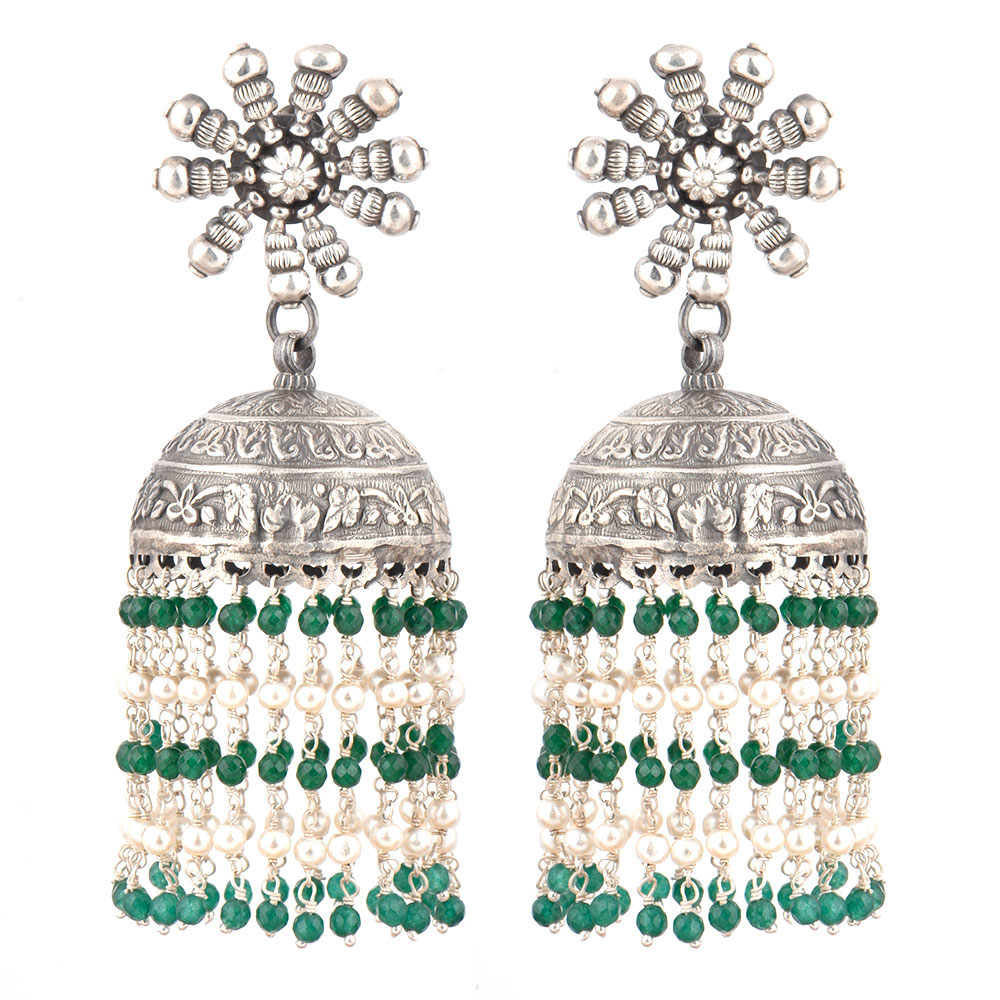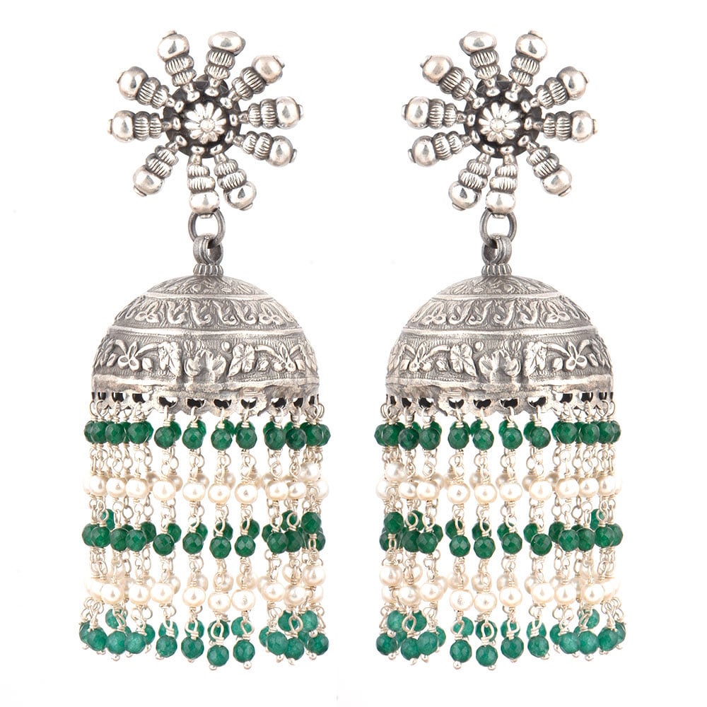 A very formal wear earrings that is made of 92.5 Sterling Silver Earrings the stud is made of a big sunflower design made of silver beads and flower in the centre .The jhumki is made of oxidized silver engraved with floral design and long tassels made of small green onyx and silver stone beads like a chandelier . Perfect party wear accessory , engagements, weddings, cocktail, Christmas and new year.