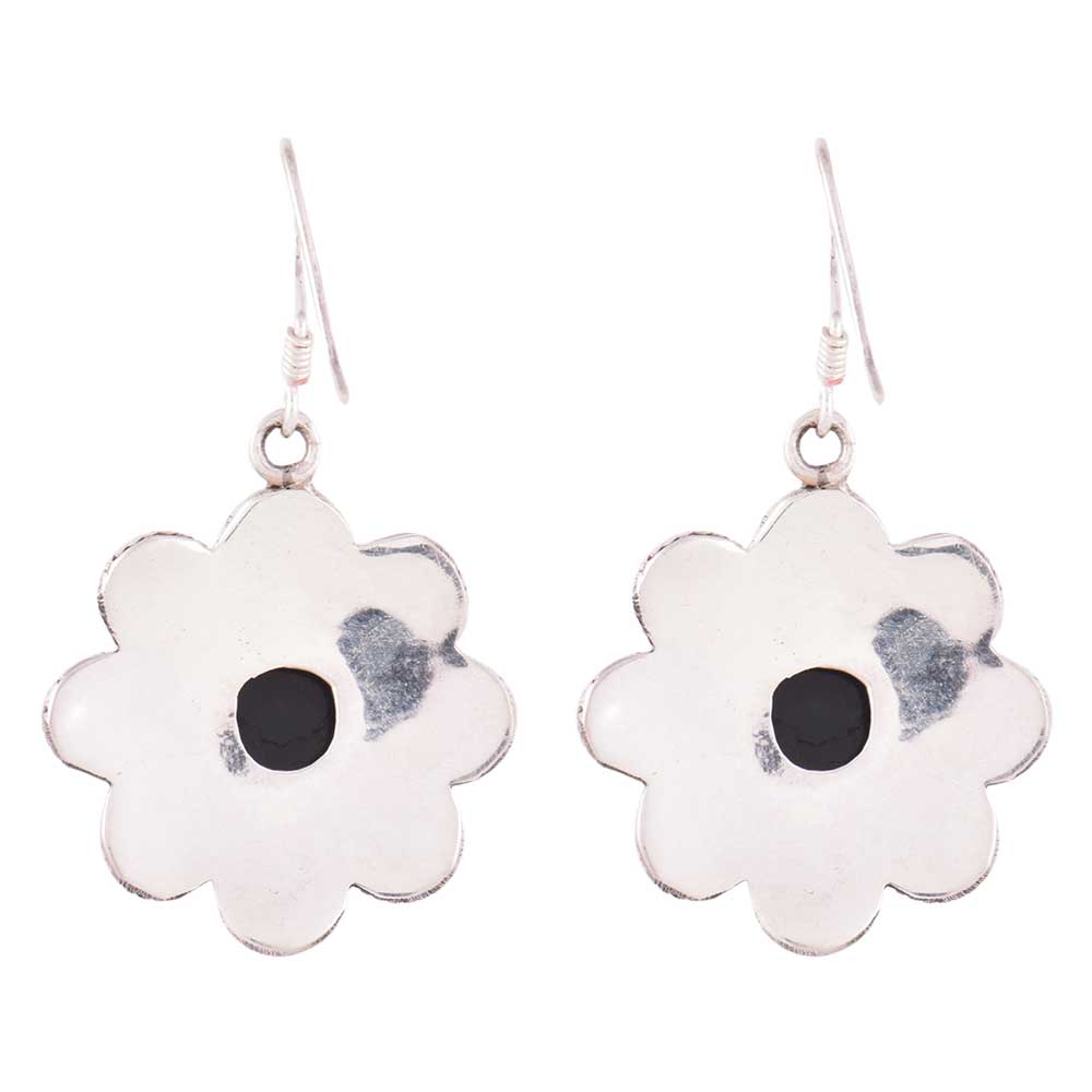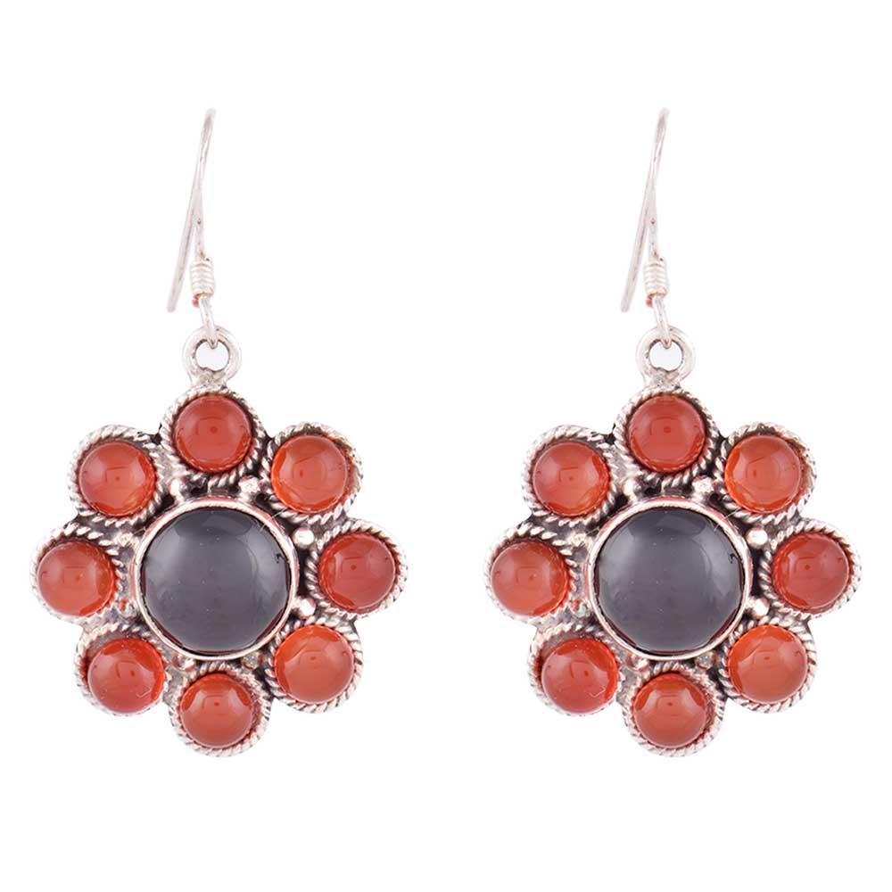 Handcrafted Carnelian stones engraved Flower Design Dangle earrings with a big black round onyx in the centre with shining sterling silver around the centre and engraved round design around the circle carnelien stones.