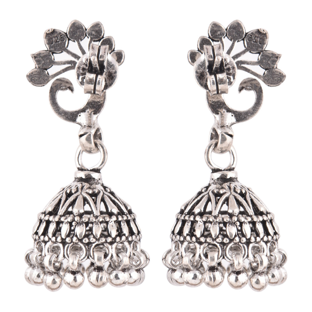 These 925 Sterling silver jhumkis can be worn at all auspicious function wedding, engagements or during the festival time. It can also be worn on regular basis. It has a lovely peacock motif top and embellished with metallic beads. An ideal present for your mother, sister or wife.