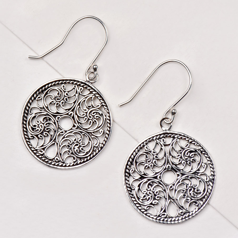 92.5 Sterling Silver Earrings Filigree Drop Round Hoop Cut Out Disc