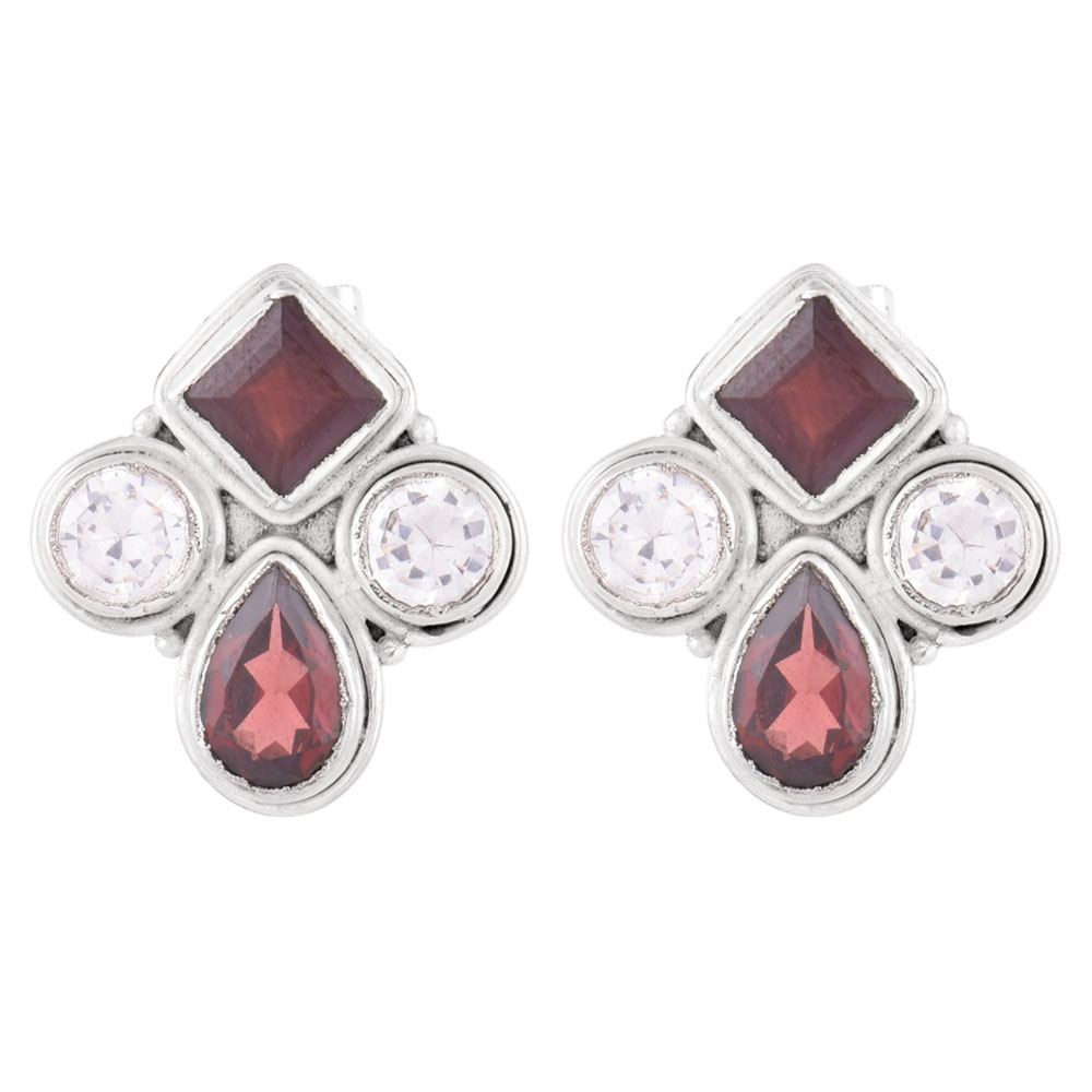 • 92.5 Sterling Silver Earrings  Garnet And American Diamond Stud Earrings