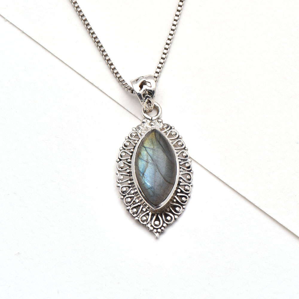 Glowing big Marquise shaped labradorite gemstones are highlighted by 92.5 Sterling Silver Pendant. They resonate a timeless and ancient aesthetic, and are perfect for everyday or a night out! Elegant bezel set pendant is handcrafted by expert artisans of India. Ideal gift for anniversary, Weddings and also for daily wear.