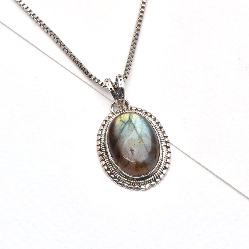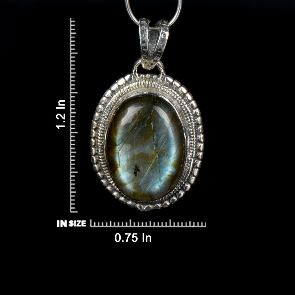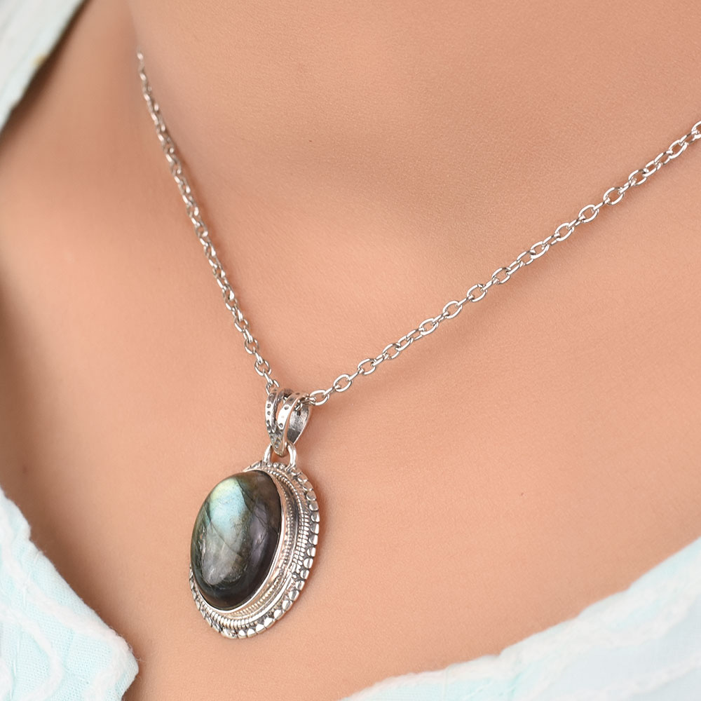 Glowing big oval shaped Labradorite gemstones are highlighted by 92.5 Sterling Silver Pendant. They resonate a timeless and ancient aesthetic, and are perfect for everyday or a night out! Elegant bezel set pendant is handcrafted by expert artisans of India. Ideal gift for anniversary, Weddings and also for daily wear.