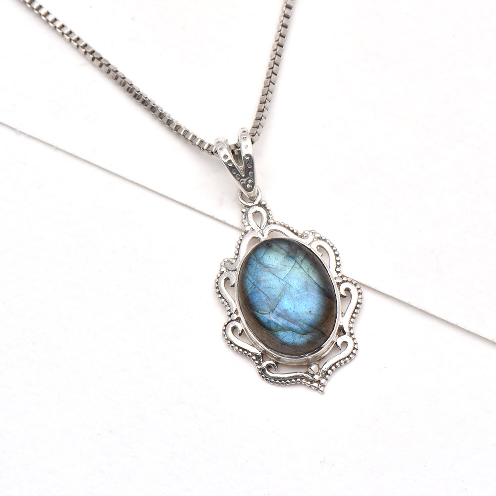 Glowing big oval shaped Labradorite gemstones are highlighted by 92.5 Sterling Silver Pendant. They resonate a timeless and ancient aesthetic, and are perfect for everyday or a night out! Elegant bezel set pendant is handcrafted by expert artisans of India. Ideal gift for anniversary, Weddings and also for daily wear.