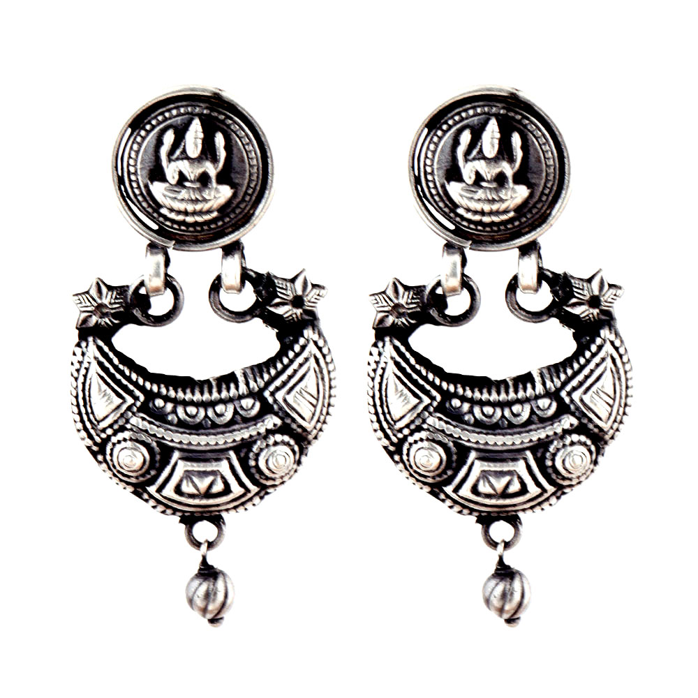 92.5 Sterling Silver Earrings Goddess Laxmi Tribal Geometric Pattern Chandbali Earrings