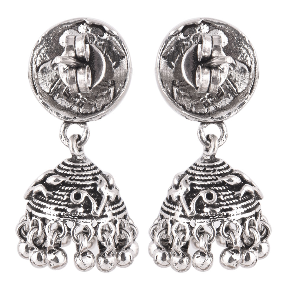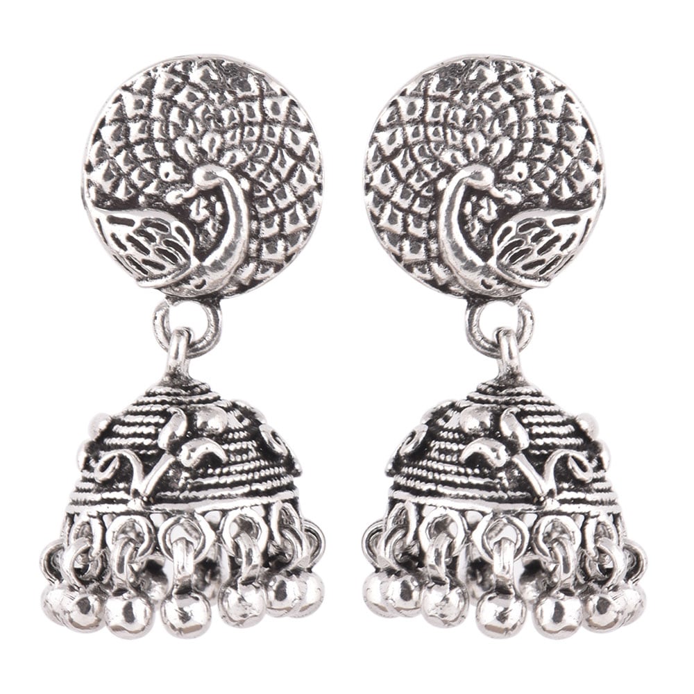 A unique looking 92.5 Sterling Silver Jhumkies Pair in Dome shape with Peacock motif on the top with hanging silver bells from our tribal jewellery collection. Wear it with a suit or a saree, for an ethnic yet classy look