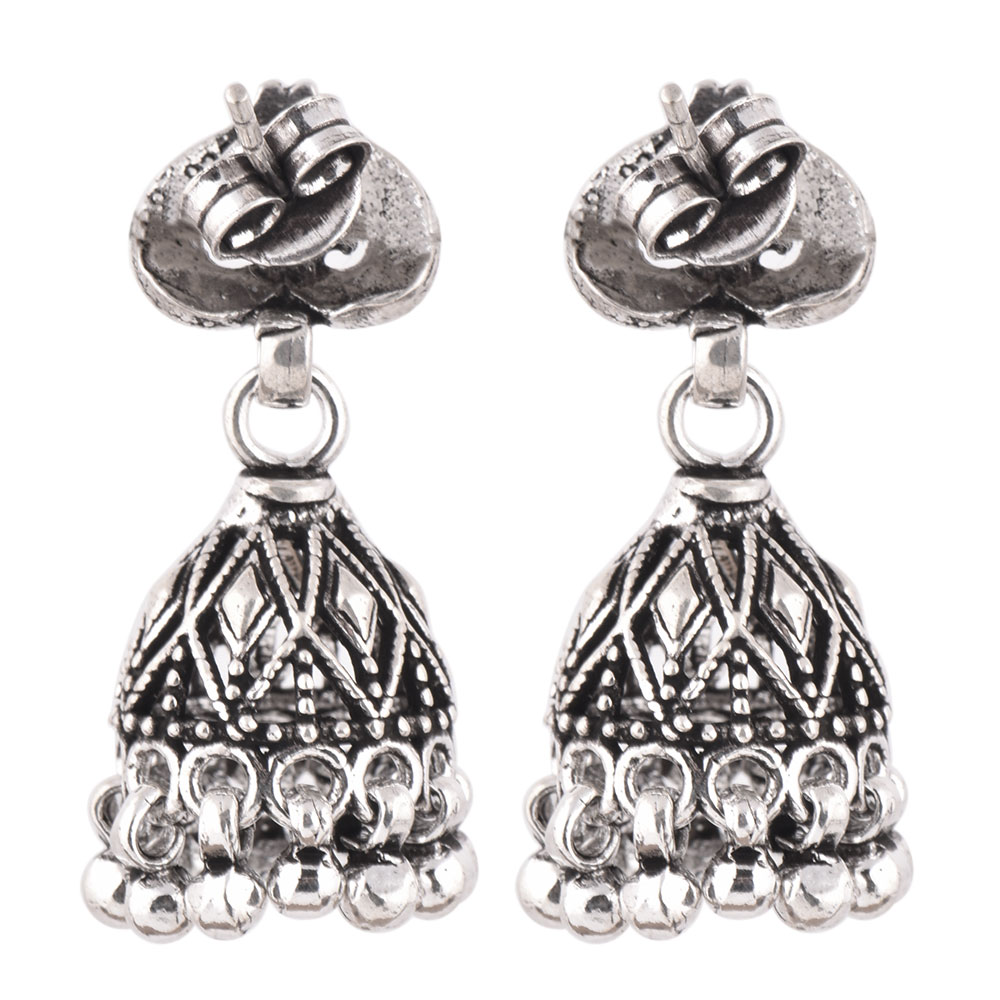 A unique looking 926 Sterling Silver Jhumkis Pair in Dome shape with Leaf Intricate motif on the top with hanging silver bells from our tribal jewellery collection can adorned beautifully with any Indian outfit. Ideal for Work And Casual Wear.
