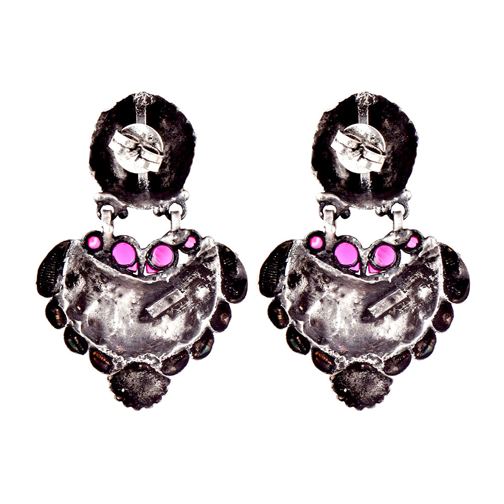 • 92.5 Sterling Silver Earrings  Lama Stud with Motifs With Fuchsia Jade Stone