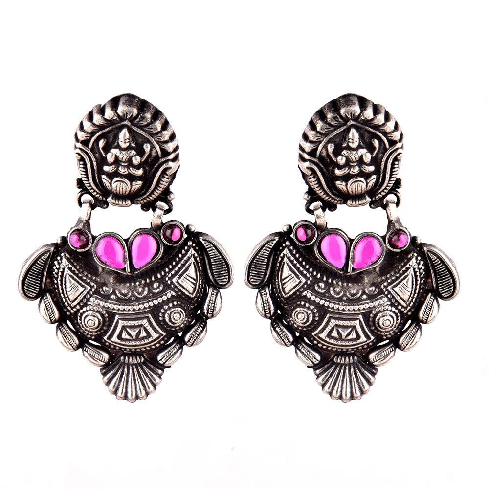 Traditional Laxmi carved stud 92.5 sterling silver earrings with geometric pattern motifs decorated with fuchsia jade stone to add color and style to simple oxidized Chadbali hangings earrings . Wear it to a wedding, reception , bridal shower, family faction or gathering. Pair it with your favorite sari, suits or long cotton kurta.