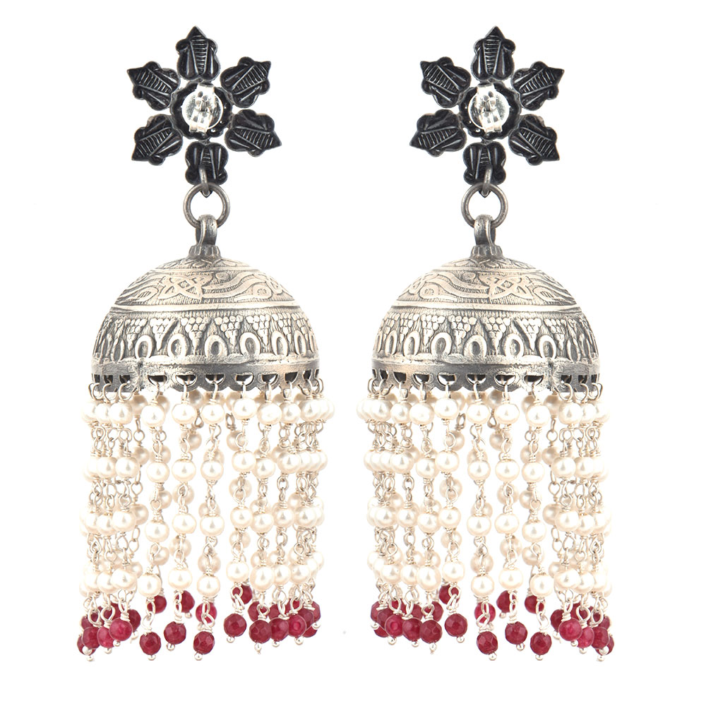 92.5 Sterling Silver Earrings Lotus Flower Jhumkis With Silver Beads And Red Onyx Beads Tassels