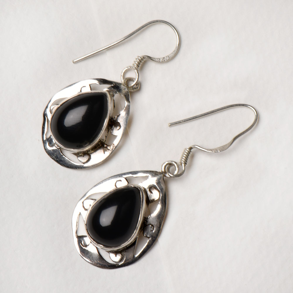 92.5 Sterling Silver Earrings Oval Black Onyx Cabochon studded with a frame engraved with tribal designs .This boho chic fashion earrings compliment traditional as well as modern wear. Step out in style and flaunt these lovely black stone hangings with a lovely black designer dress for that special occasion.