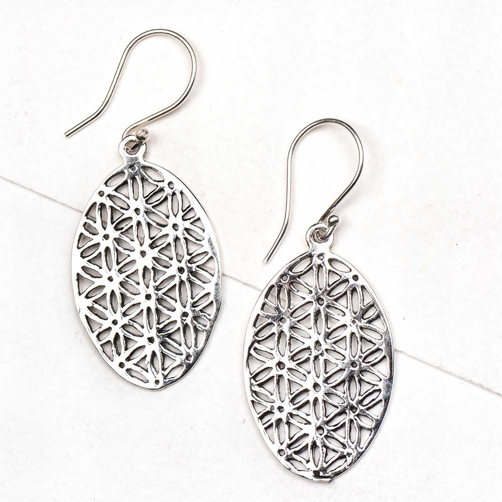 92.5 Sterling Silver Earrings Oval Sacred Flower Of Life Design Earrings