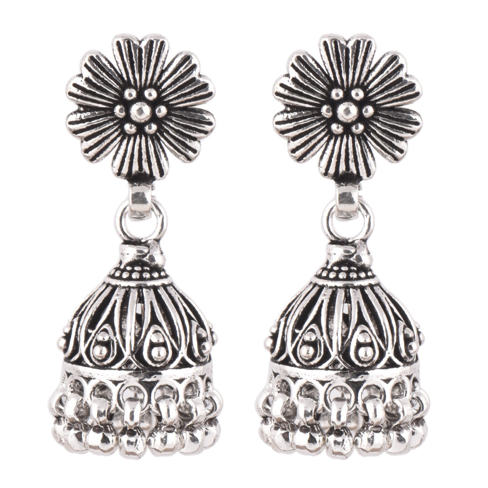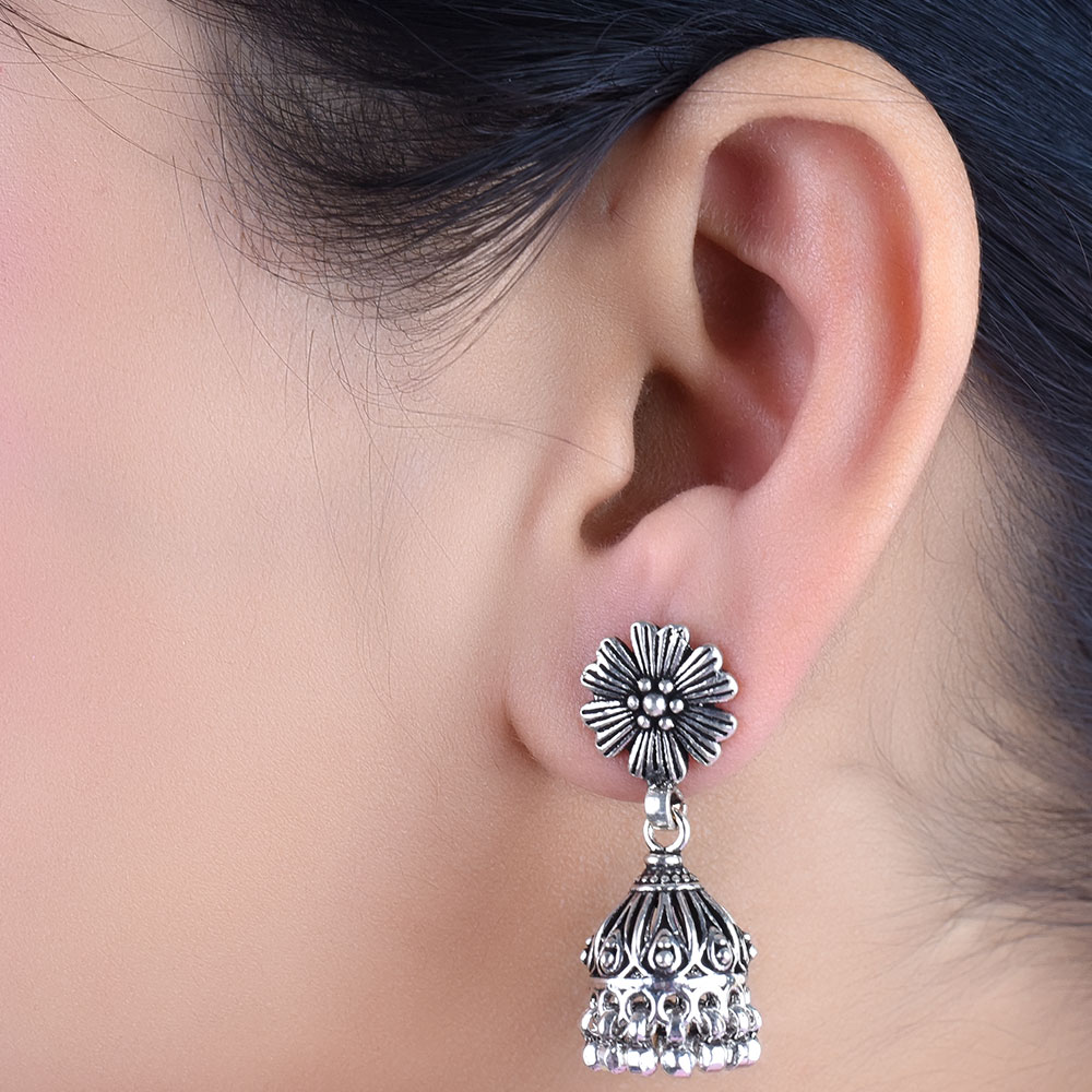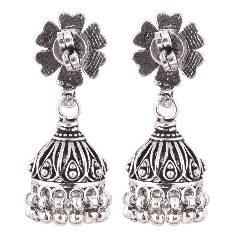 • 92.5 Sterling Silver Earrings Oxidized Flower Stud Tribal Jhumka/Jhumki With Silver Beads