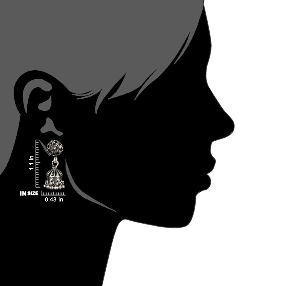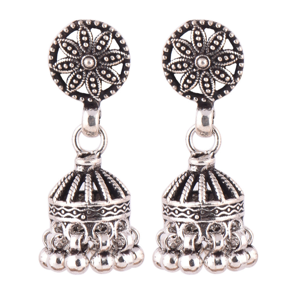 A unique looking 926 Sterling Silver Jhumkis Pair in Dome shape with floral motif on the top with hanging silver bells from our tribal jewellery collection can adorned beautifully with any Indian outfit. Ideal for Work And Casual Wear.