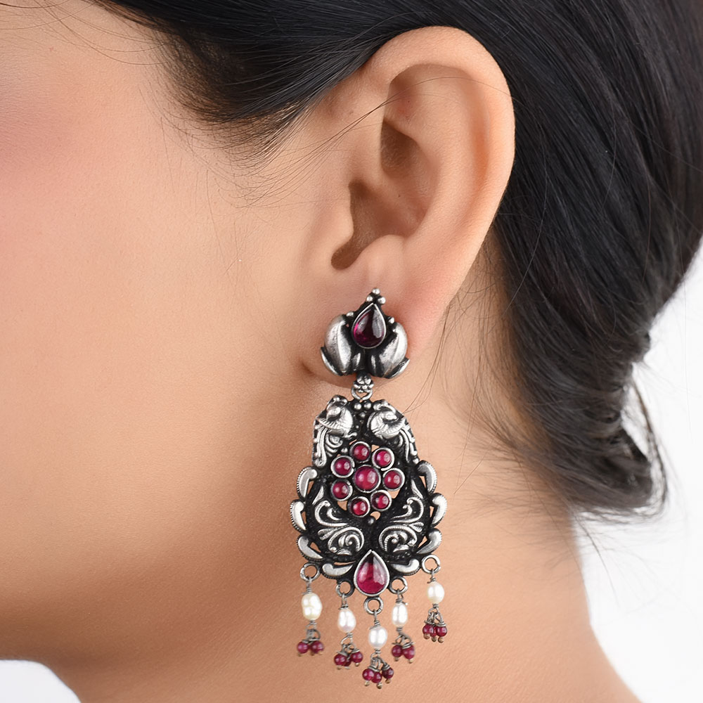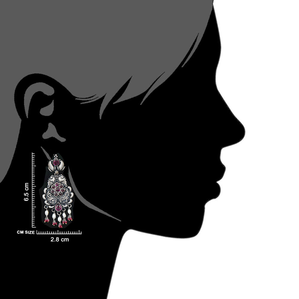 • 92.5 Sterling Silver Earrings Peacock Fuchsia Danglers With Red Chalcedony And Pearl Tassels For Girls
