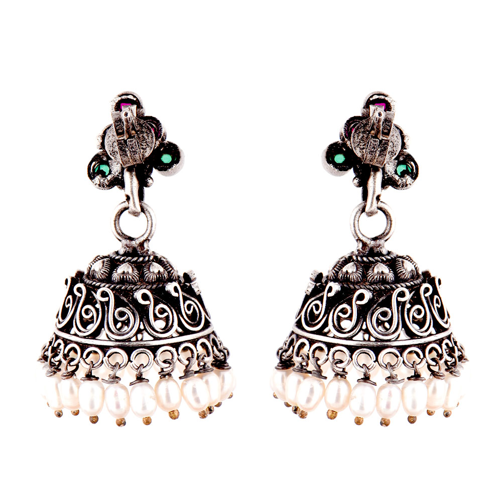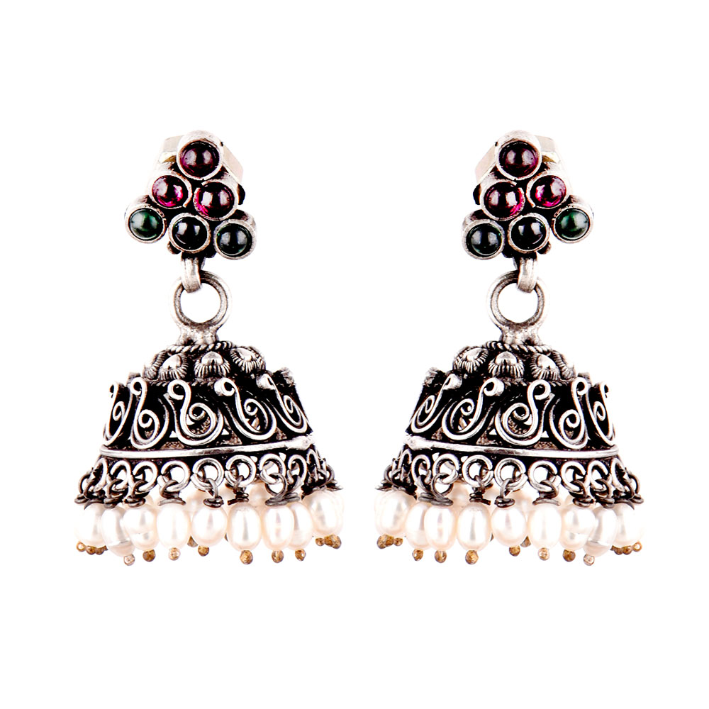 • 92.5 Sterling Silver Earrings Pink Jade and green Onyx Stone Studded Jhumkis with Pearl Hangings