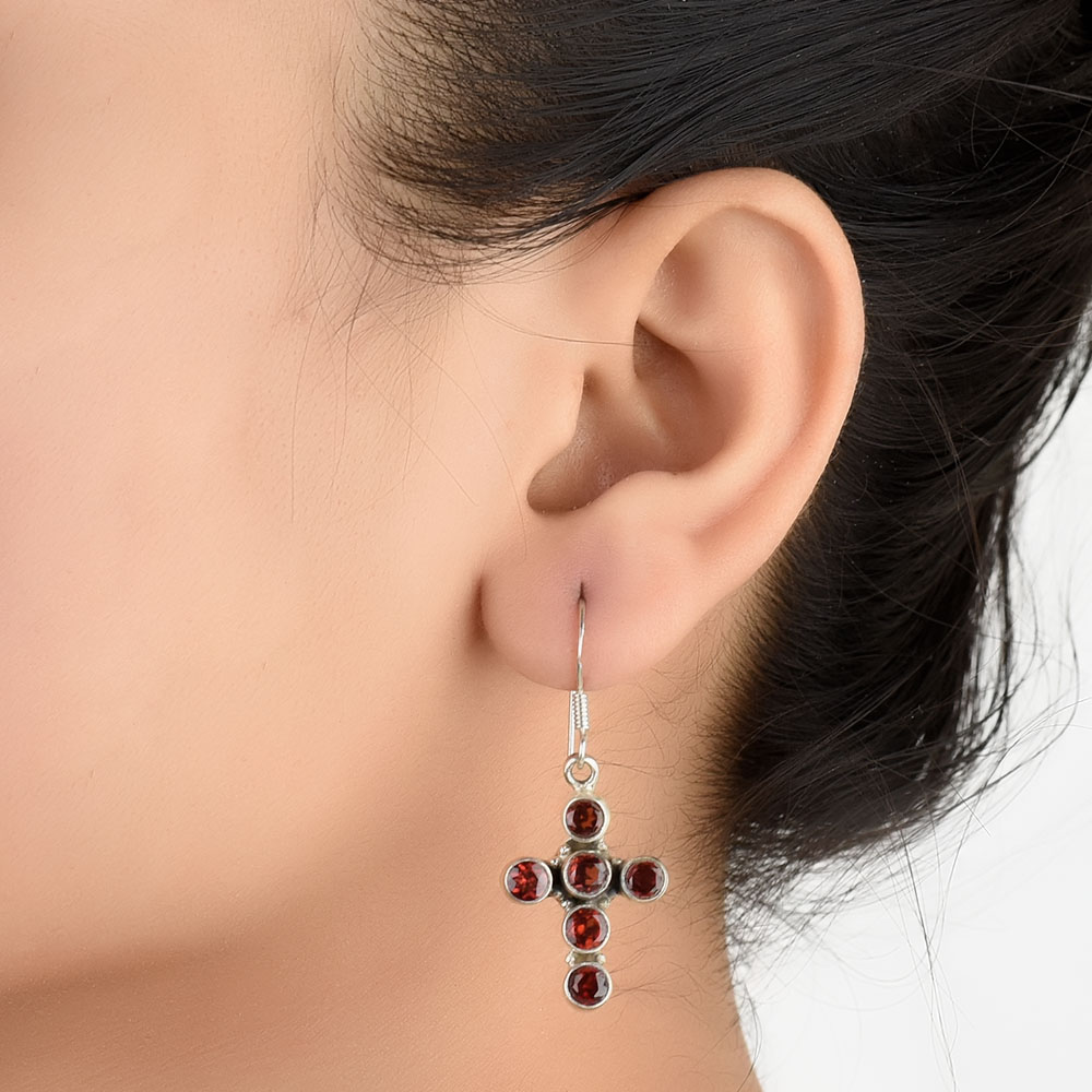 92.5 Sterling Silver Earrings Red Garnet Cross Hanging Earrings