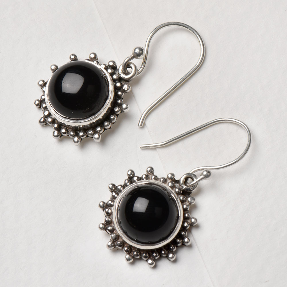 Simple 92.5 Sterling Silver Earring With Two Black Onyx Stones in a floral engraved border surrounding the stone .This earring can be worn every day to office, college or to the market. It is also the ideal gift to your sister, friend or mother.