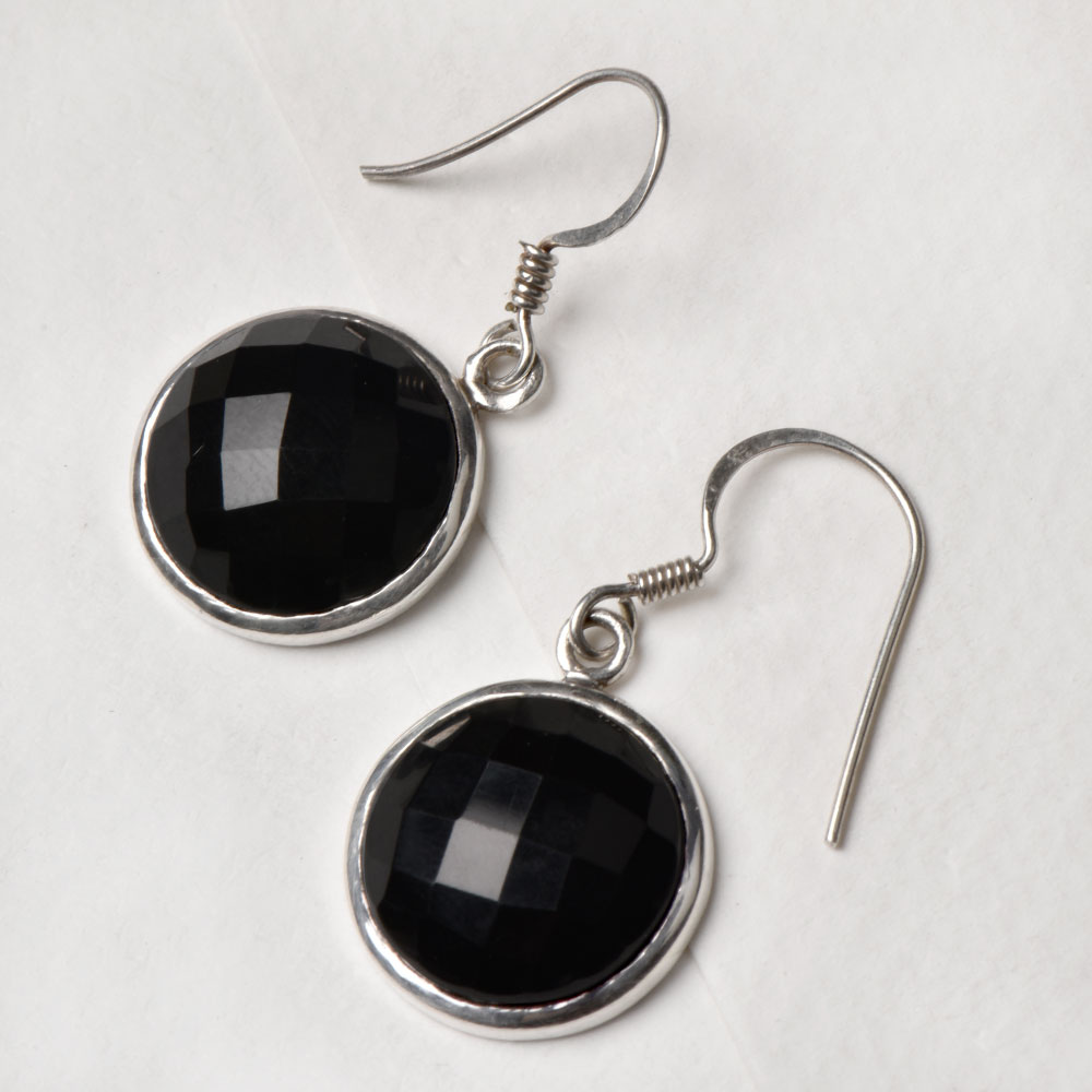 • 92.5 Sterling Silver Earrings Round Onyx Stone With Ring Border Drop Earrings