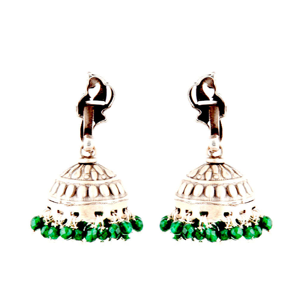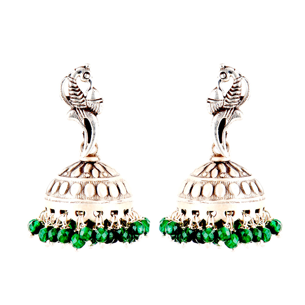 A very classic 92.5 Sterling Silver Earrings with standing peacock stud engraved jhumki with green Onyx beads tassels can be matched with a lovely green chiffon or cotton sari, suits, lehengas or kurtis . Buy it yourself or gift it to your near or dear ones.
