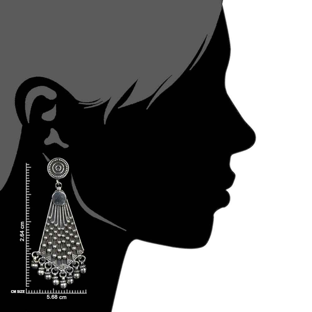 92.5 Sterling Silver Earrings triangle shape with embossed tribal pattern and silver bead hangings adds a tribal touch to your traditional attire. Perfect for gifting your sister friend , fiance, daughter, mother and wife etc.