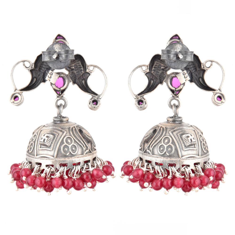 • 92.5 Sterling Silver Earrings Twin Peacock Oxidized Pink Tourmaline Jhumki Earrings