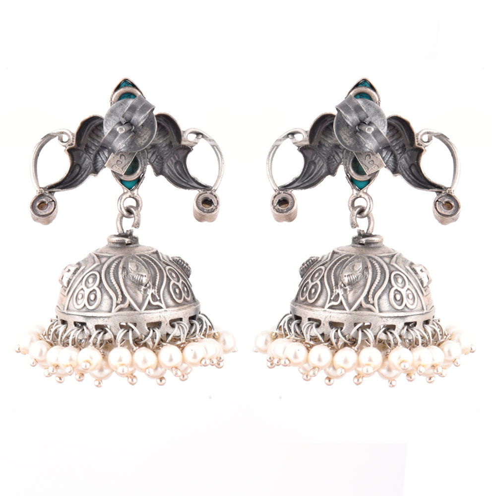 92.5 Sterling Silver Earrings Twin Peacock Oxidized Turquoise Jhumki Earrings