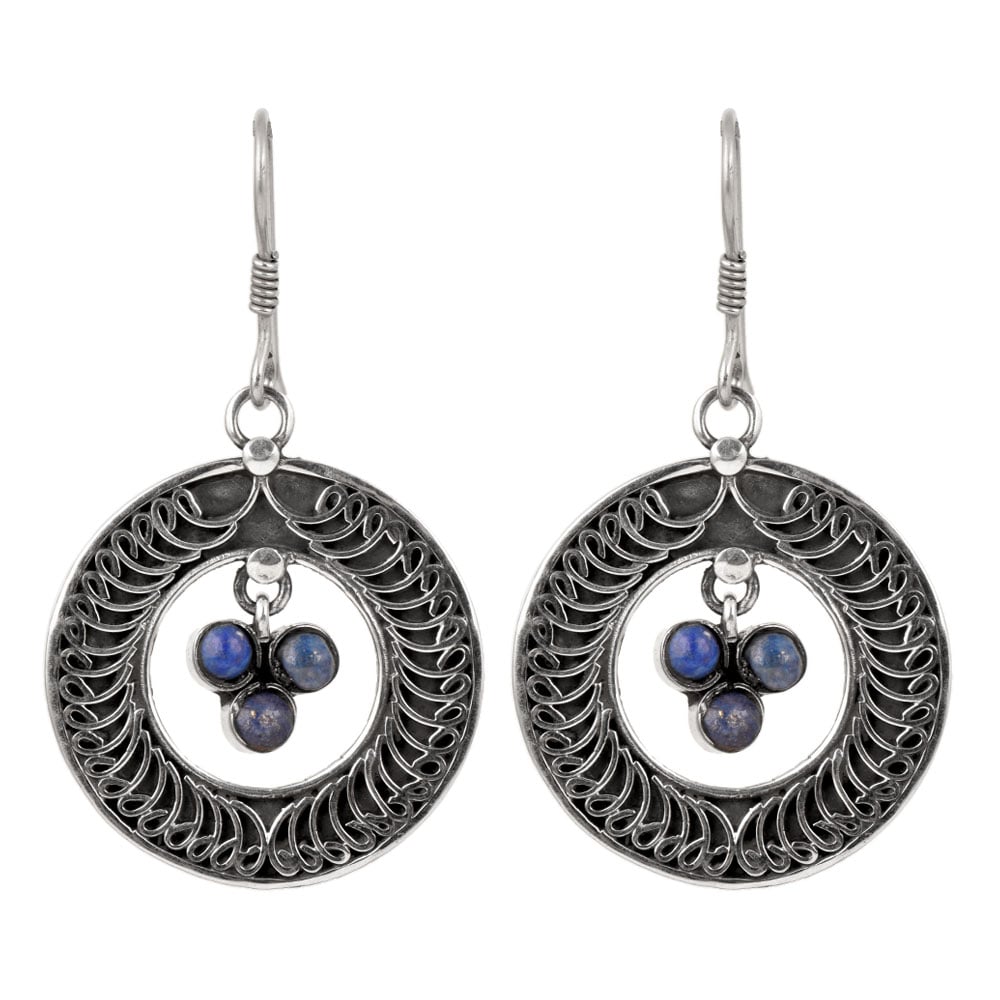 Handmade Beautiful hangings 92.5 sterling silver earrings are made of 925 sterling silver in a sculpture design with blue colored Lapis Lazuli stones hanging inside a circular design are fantastic earrings to wear and enjoy forever.