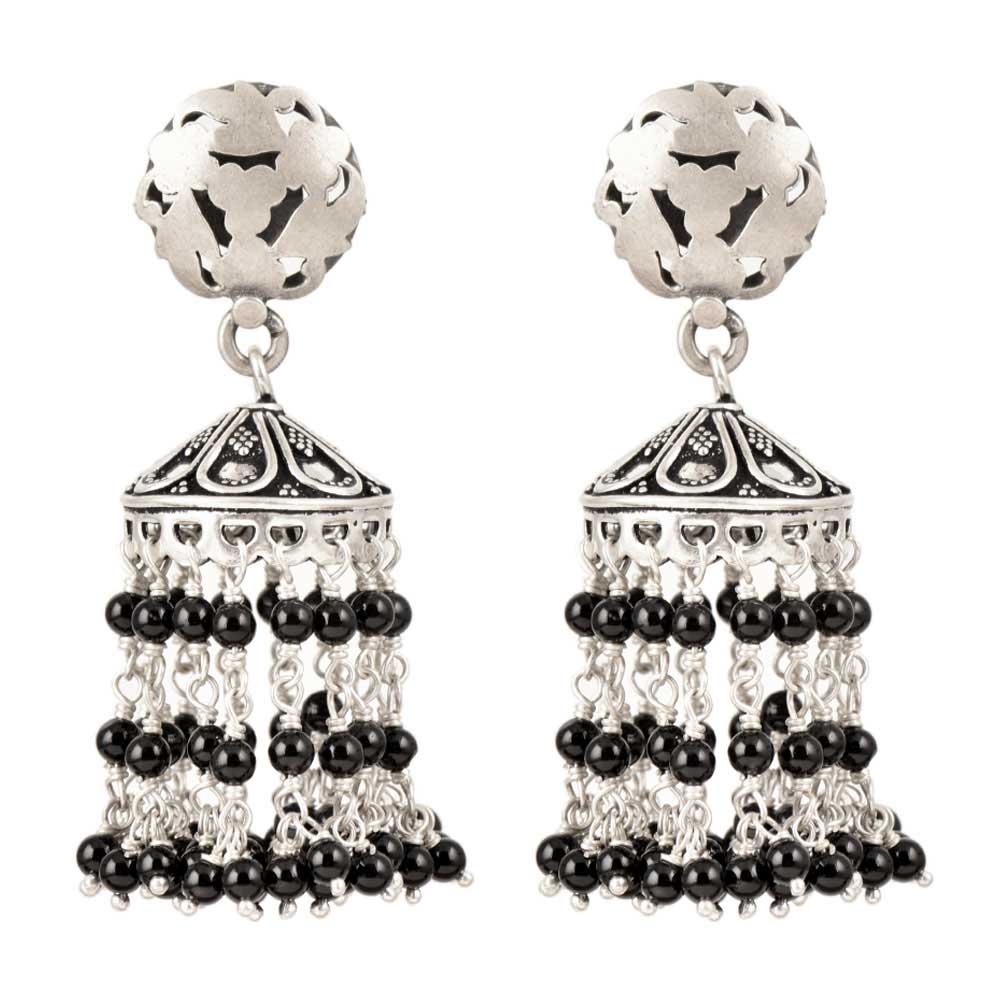 • 92.5 Sterling Silver Earrings With Pearl And Black Beads Tassel Jhumkas Earrings