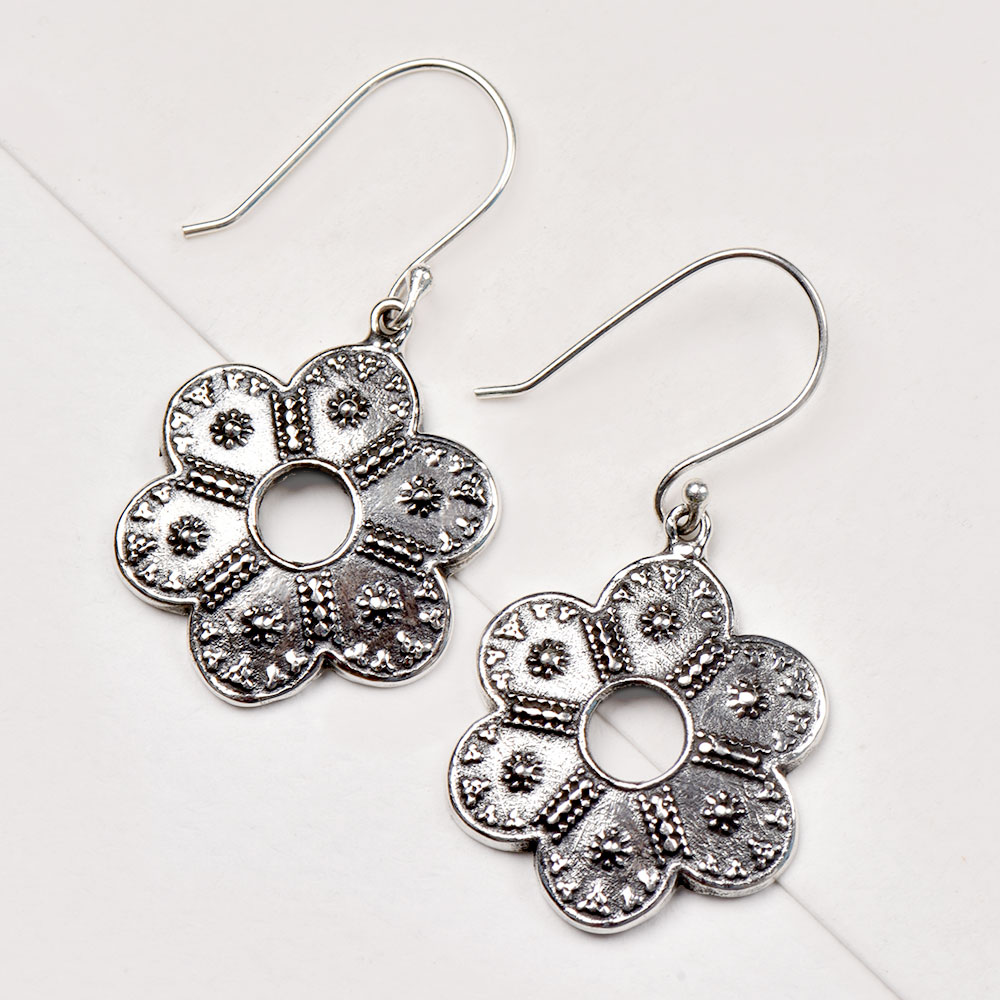 92.5 Sterling Silver Elegant Flower Design Ear Hook Dangle Earrings