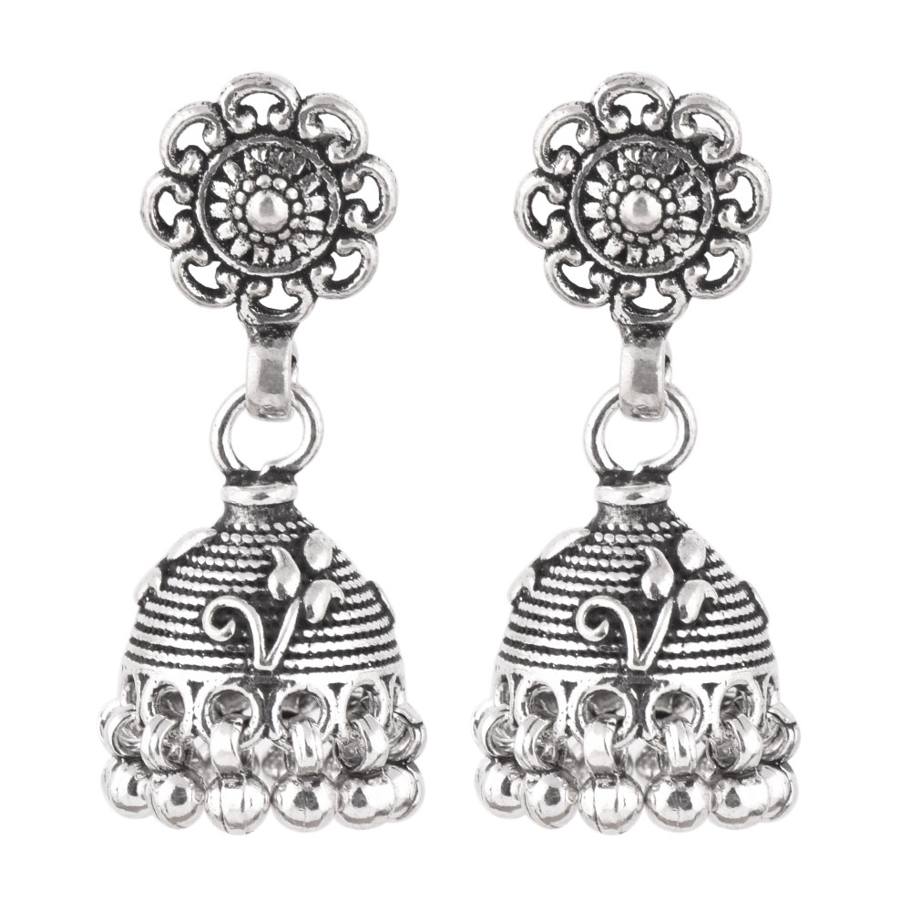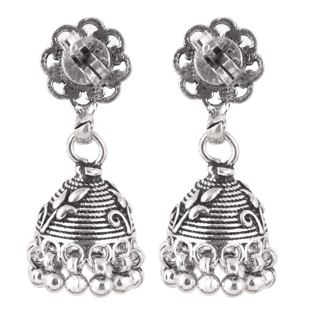 A unique looking 926 Sterling Silver Jhumkis Pair in Dome shape with floral motif on the top with hanging silver bells from our tribal jewellery collection can adorned beautifully with any Indian outfit. Ideal for Work And Casual Wear.