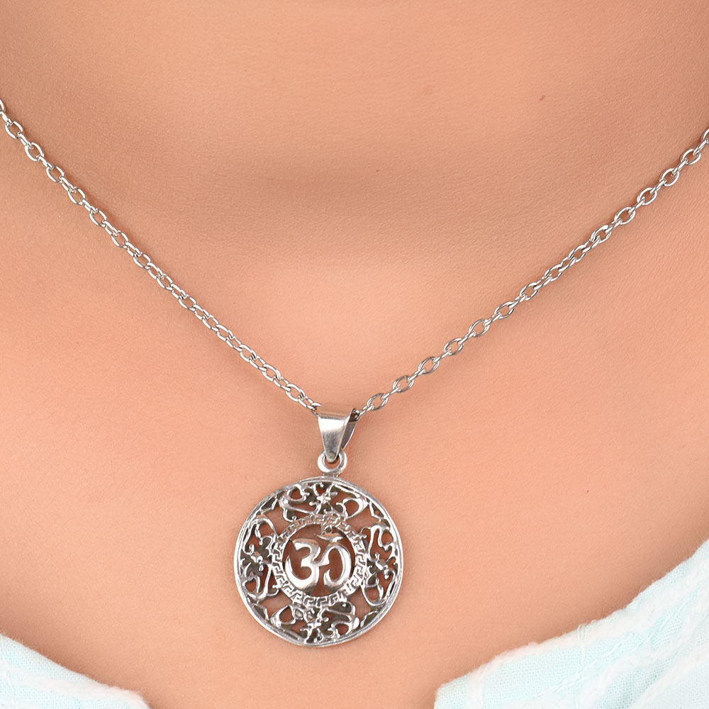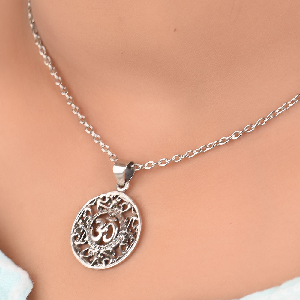 Adorn your necklace framed om symbol surrounded by intricate jail patterns floral design in sterling silver metal is handcrafted to perfection with a flawless finish. This radiant pendant is made from the finest 925 sterling silver that is the perfect treat for yourself or your friends and relatives.