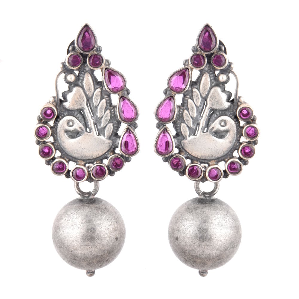 • 92.5 Sterling Silver Peacock Engraved Pink Tourmaline studded Ball Drop Earrings