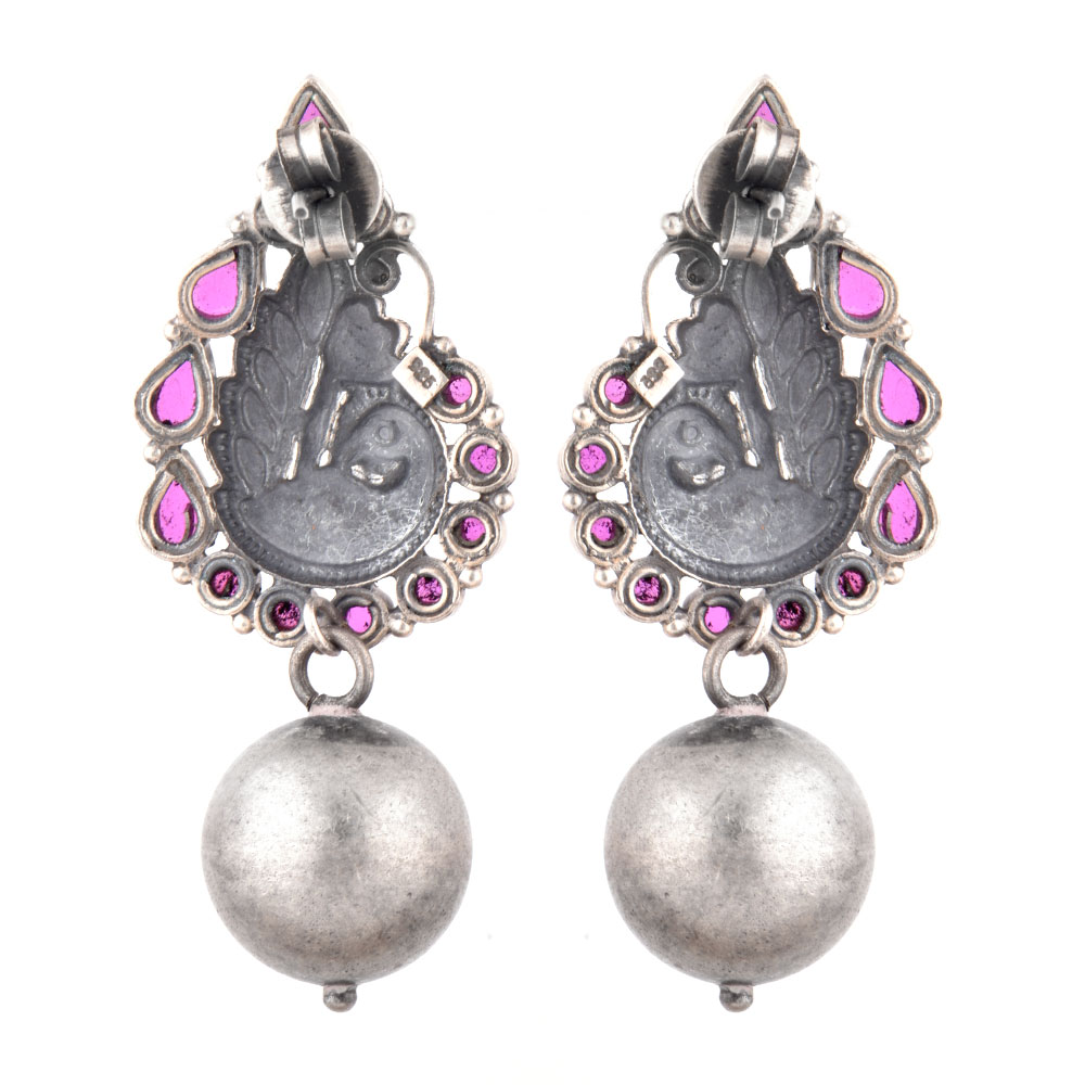 92.5 Sterling Silver Peacock Engraved Pink Tourmaline studded Ball Drop Earrings
