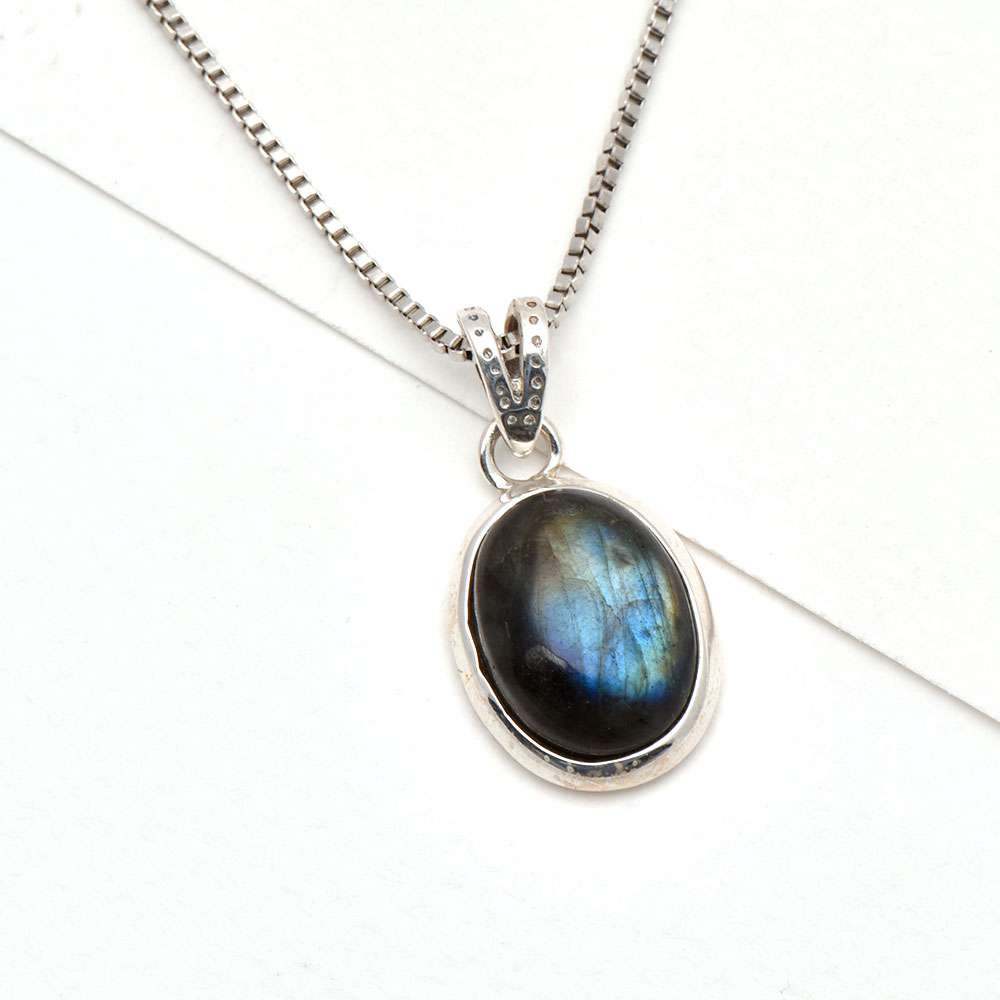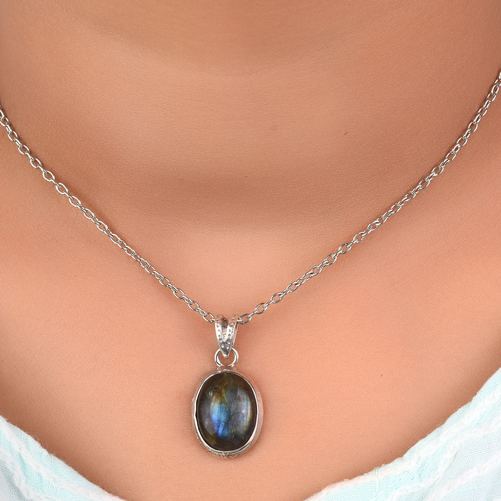 Glowing big oval shaped Labradorite gemstones are highlighted by 92.5 Sterling Silver Pendant. They resonate a timeless and ancient aesthetic, and are perfect for everyday or a night out! Elegant bezel set pendant is handcrafted by expert artisans of India. Ideal gift for anniversary, Weddings and also for daily wear.
