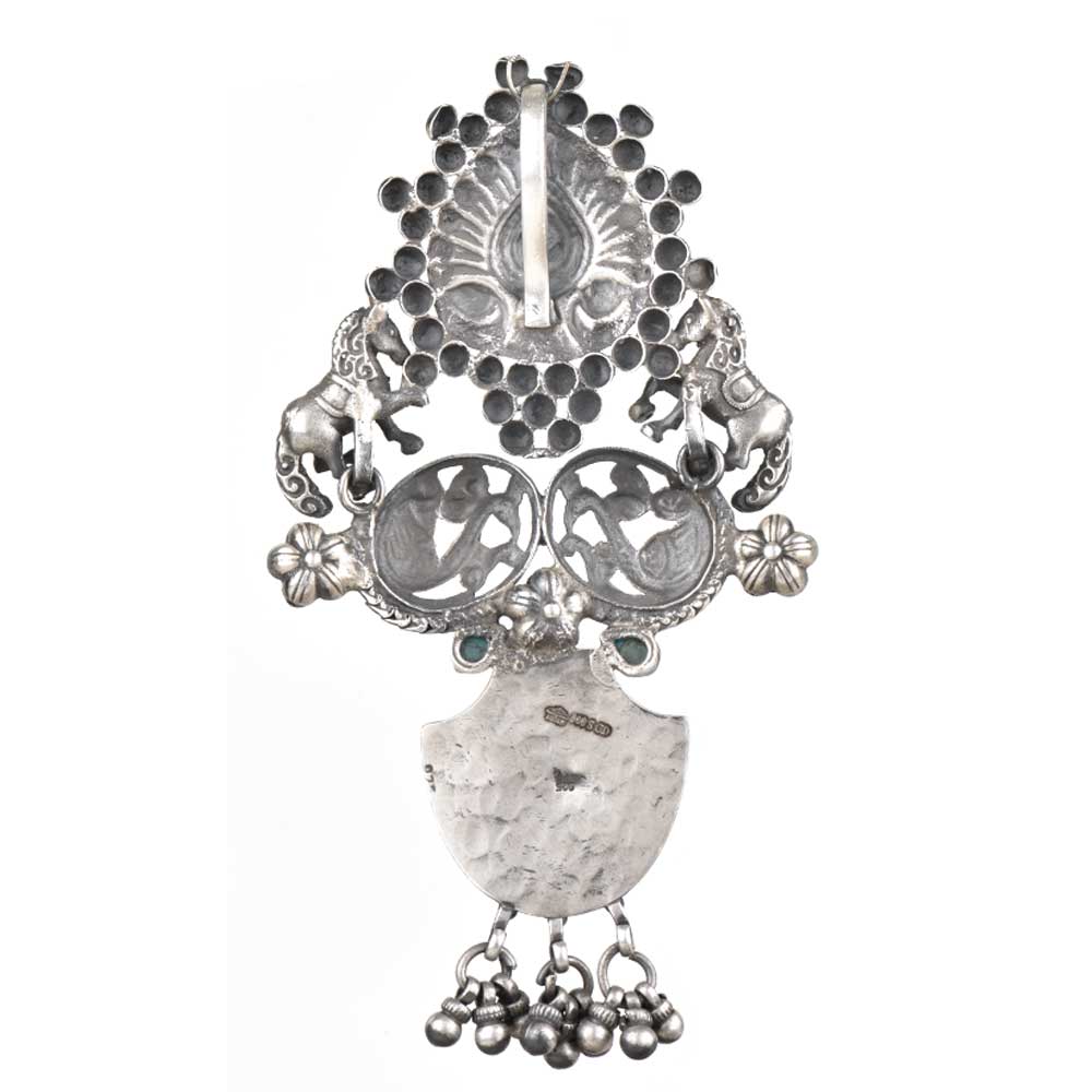 Handcrafted silver (92.5 sterling silver) pendant in a beautifully carved with twin horse statues and peacocks on either side of a beautifully carved amulet or charm and plenty of ghungroos. It goes well with all traditional attire. It trendy fusion jewellery that can be worn on wedding, festival, party, and on any occasion.
