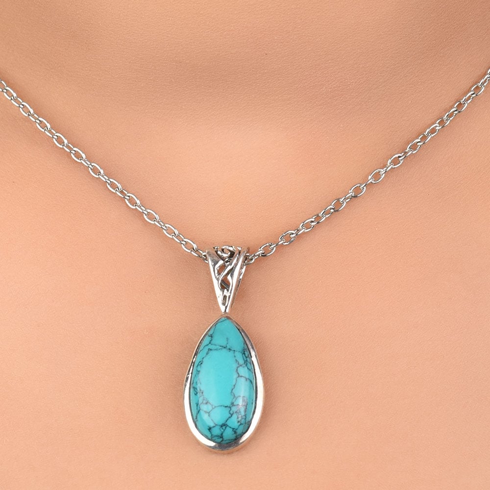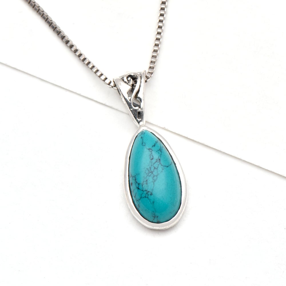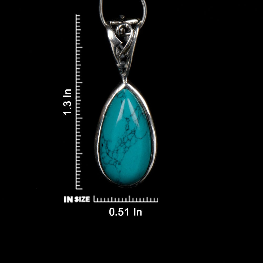 This elegant and traditional pendant comes in long elongated teardrop shaped turquoise gemstone, which is rather simple but stunning stone in a silver frame. Ideal for gifting and perfect for everyday or that special night out.