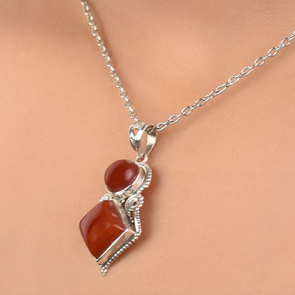 Handmade by the Indian artisans this pendant has been studded with two carnelian in gorgeous shade of russet red. The unique tiered design allows the pendant to move with you and shine elegant in the light. This piece is the perfect size to make a statement, while still being comfortable enough for everyday wear. Ideal for gifting and perfect for everyday or that special night out.