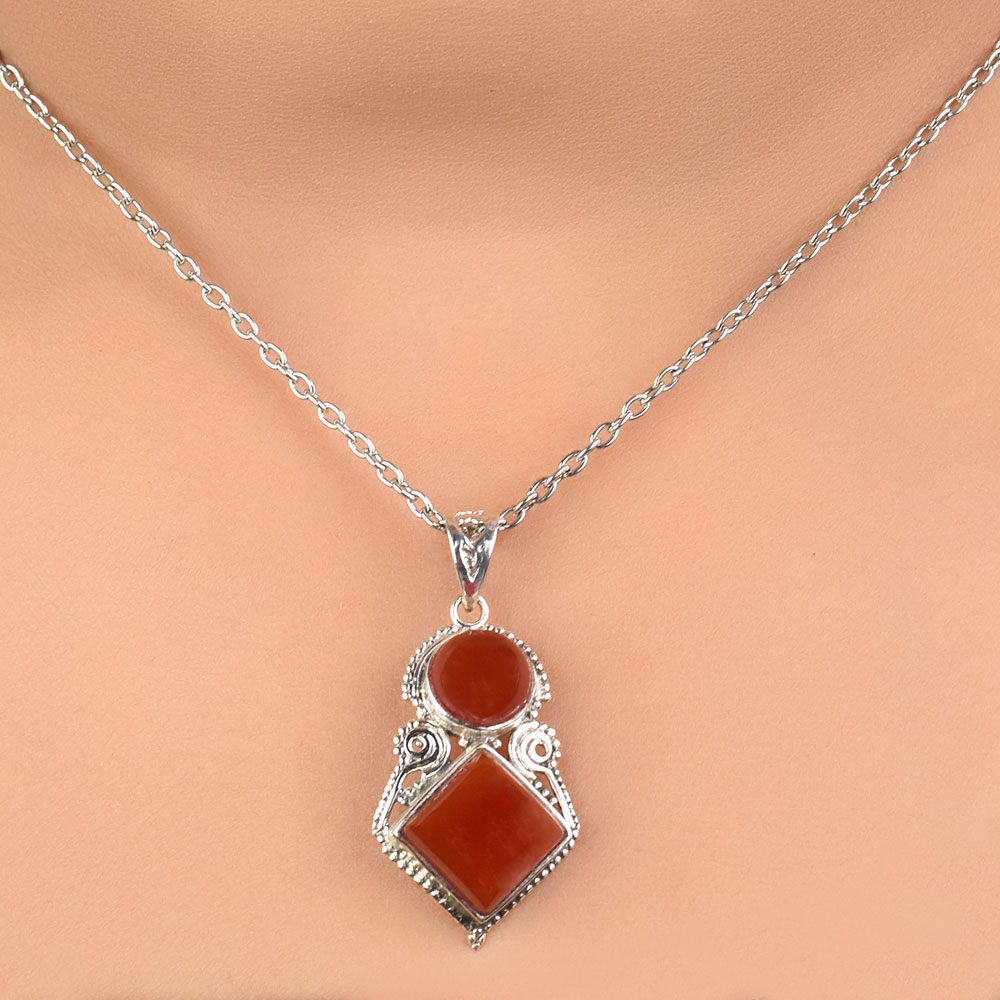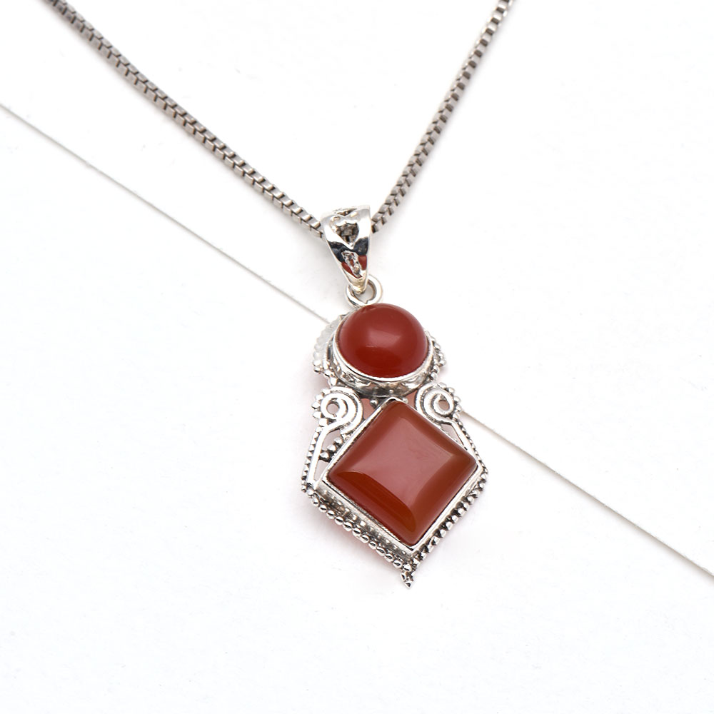 • 92.5 Sterling Silver Pendant Round And Square Tiered Red Carnelian Stone