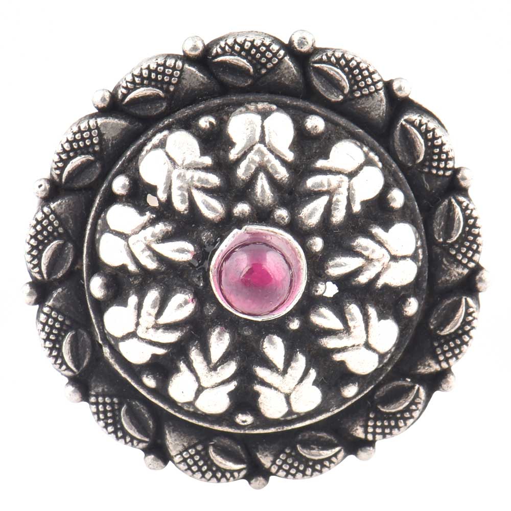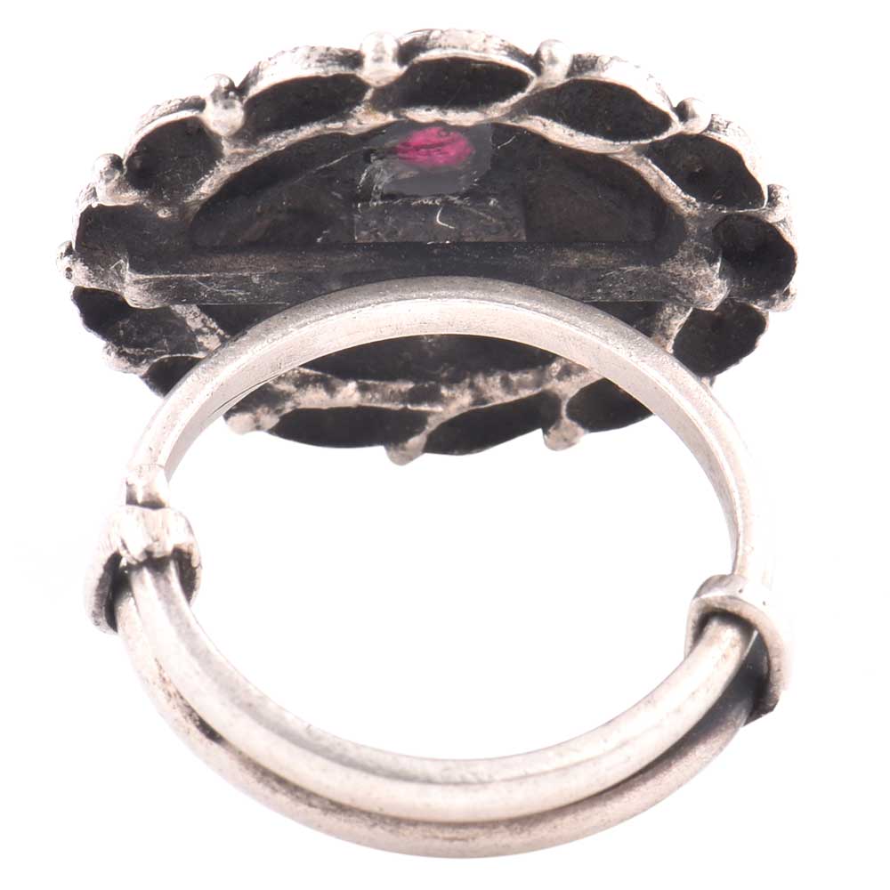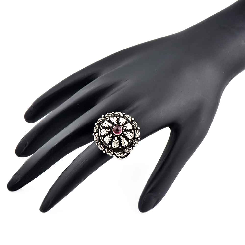 92.5 Sterling Silver Ring Oxidized Amethyst And Leaf Pattern Adjustable Embossed Ring (Free Size)