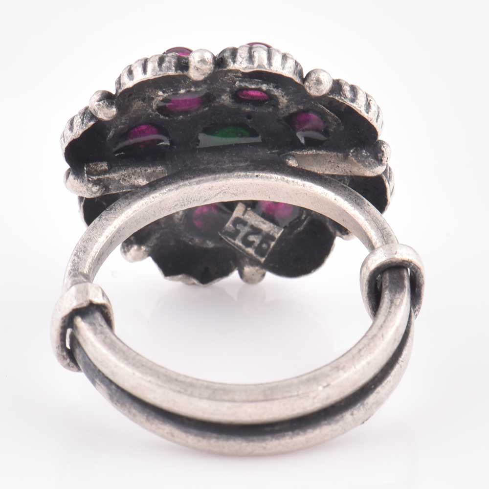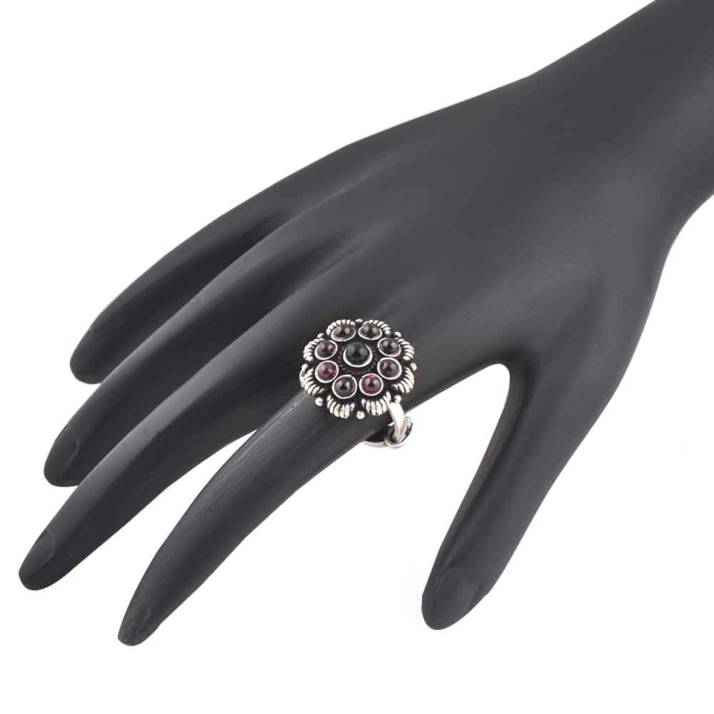 • 92.5 Sterling Silver Ring Round Amethyst stones and Onyx Studded Statement Ring (Free Size)
