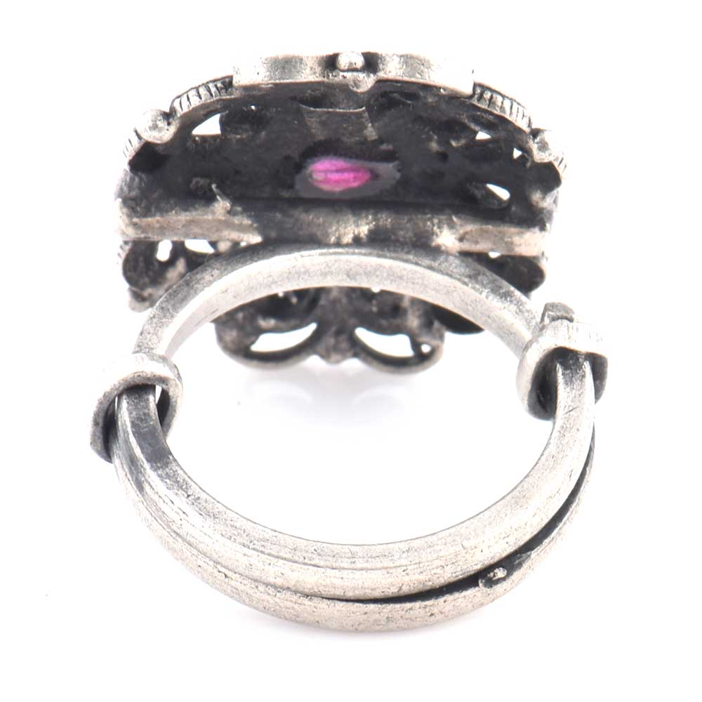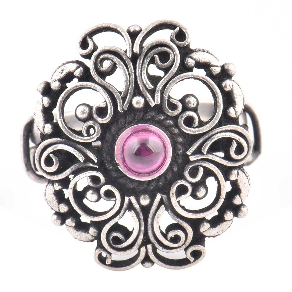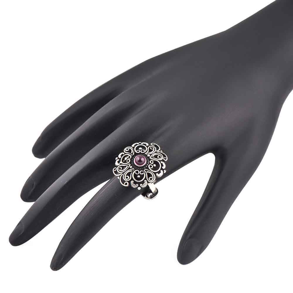 A very traditional 92.5 Sterling Silver Ring has a lovely scroll work and motifs with a small round amethyst stone in the centre is suitable for girls and women of all age group. Pair it with your traditional attire like a lehenga, sari, salwar suit, gown or other long dress