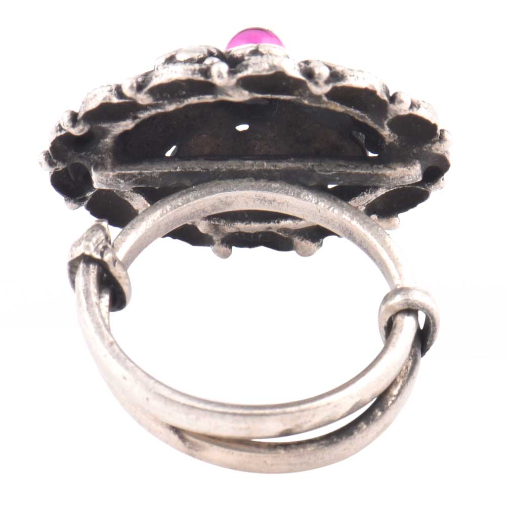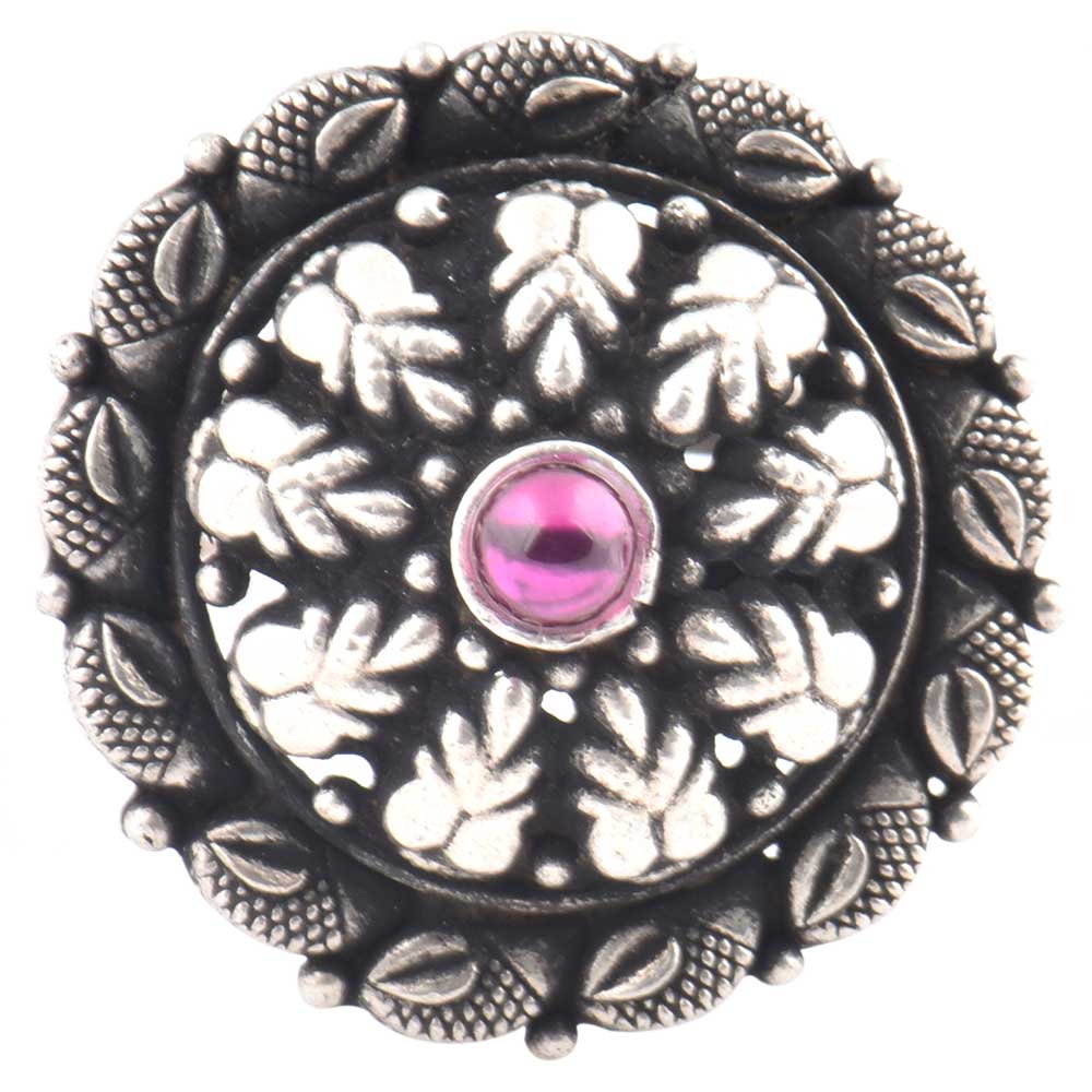 An all time favorite with women this handcrafted 92.5 sterling Silver ring that has a traditional design and feel with a small amethyst stone in the centre with a band of small pear shaped motifs and a pointed edges border. Wear it to Engagement, cocktail, wedding and birthdays ,picnic or office get together.